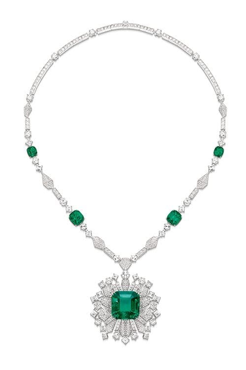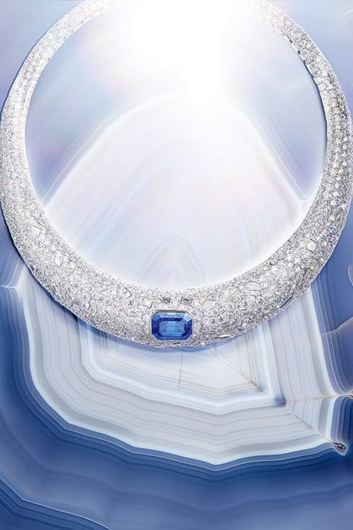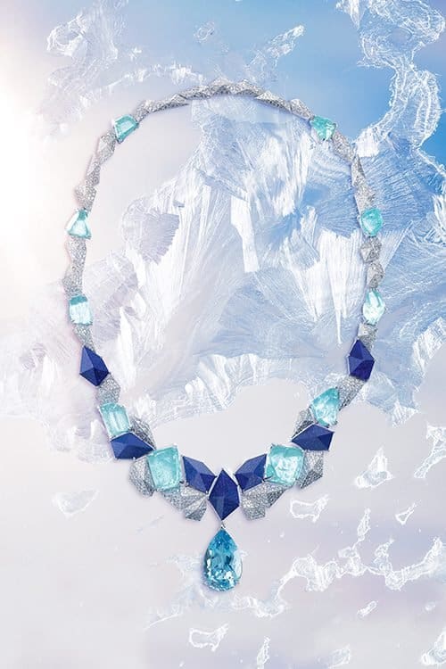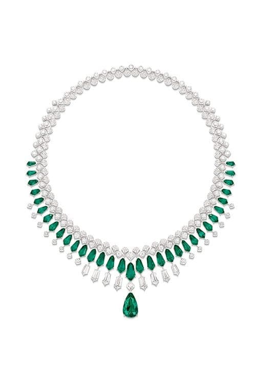Like the glistening plateau of a freshly formed iceberg, a fancy-cut cabochon tourmaline of 24.73 carats is the centre stone of a ring set with multiple brilliant-cut diamonds in white gold (G34HY400). Forming the heart of a necklace, an emerald-cut emerald of 18.88 carats is set off by a surround of fine goldwork and diamonds of varied size (G37N5600). A cascading necklace of drops and frosted points sparkles with green. The necklace is crowned by a pear-cut emerald of 7.50 carats (G37N5700). Another necklace paved with brilliant and fancy-cut diamonds hugs the throat to display a sapphire of deepest blue (G37N5400).