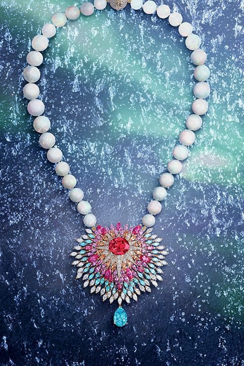 With an explosion of colour, a pendant necklace shows a generous heart. An oval-cut red spinel radiates outwards in red and pink spinels, Paraiba tourmalines, spessartites and white opals (G37N6800). The starry sky of the Great North is charged with elation and joy. Turning slowly without shadows, it lights up the night.