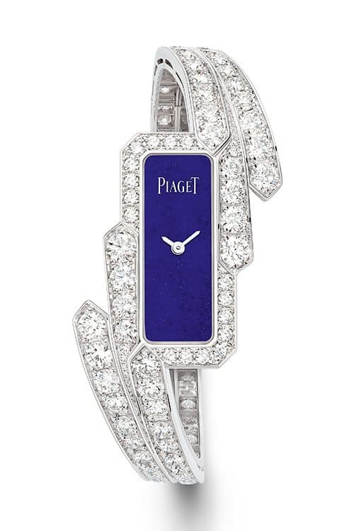 Exalting Sights, the second theme, celebrates nature in transformation. A necklace with a playful graphical design is set with shades of blue: lapis lazuli, Paraiba tourmalines and aquamarines collide with waves of brilliant-cut diamonds (G37N6100). Like a winter dream, a watch of diamonds and white gold is coloured by a cushion-cut emerald of 1.8 carats and marquise-shaped emeralds (G0A43262). Two waves of diamonds close around a night-blue sea created of lapis lazuli forming the dial of the watch (G0A43264).