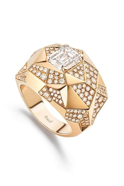 A necklace brilliantly displays dozens of pink-gold engraved batons decorated with marquise-cut diamonds. As a solar centre stone, an emerald-cut emerald of 6.02 carats gleams a deep green (G37N7000). A signature of the Maison Piaget, a cuff-bracelet in pink gold is set with a marquetry motif of feathers and gold leaves, like scintillating light reflecting off a crystalline frozen sea (G36M7800). A ring sparkles with brilliant-cut diamonds and a large cushion-cut diamond of 2.3 carats (G34HY200). A watch set with diamonds and white gold is completed by a bracelet of rose-cut and brilliant-cut diamonds, like little droplets of freshly melted snow (G0A43270).