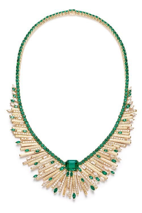 The collection features some remarkable savoir-faire such as the ‘Palace decoration;’ an engraving process inspired by Haute Couture. It involves hand-guilloching gold with irregular streaks to give the effect of raw silk. The result is a supple, fabric-like appearance, and an inimitable glow that accentuates the sparkle of precious stones. This engraving process is a true Piaget signature for which the Maison has long been renowned. Combined with gold polishing and diamond setting, such High Jewellery creations push the limits of expertise and creativity. The Midnight Sun necklace displays the Palace decoration with particular brilliance. In this instance, the marquise-cut diamonds lead naturally to the profoundly intense green of a large emerald (G37N7000).
