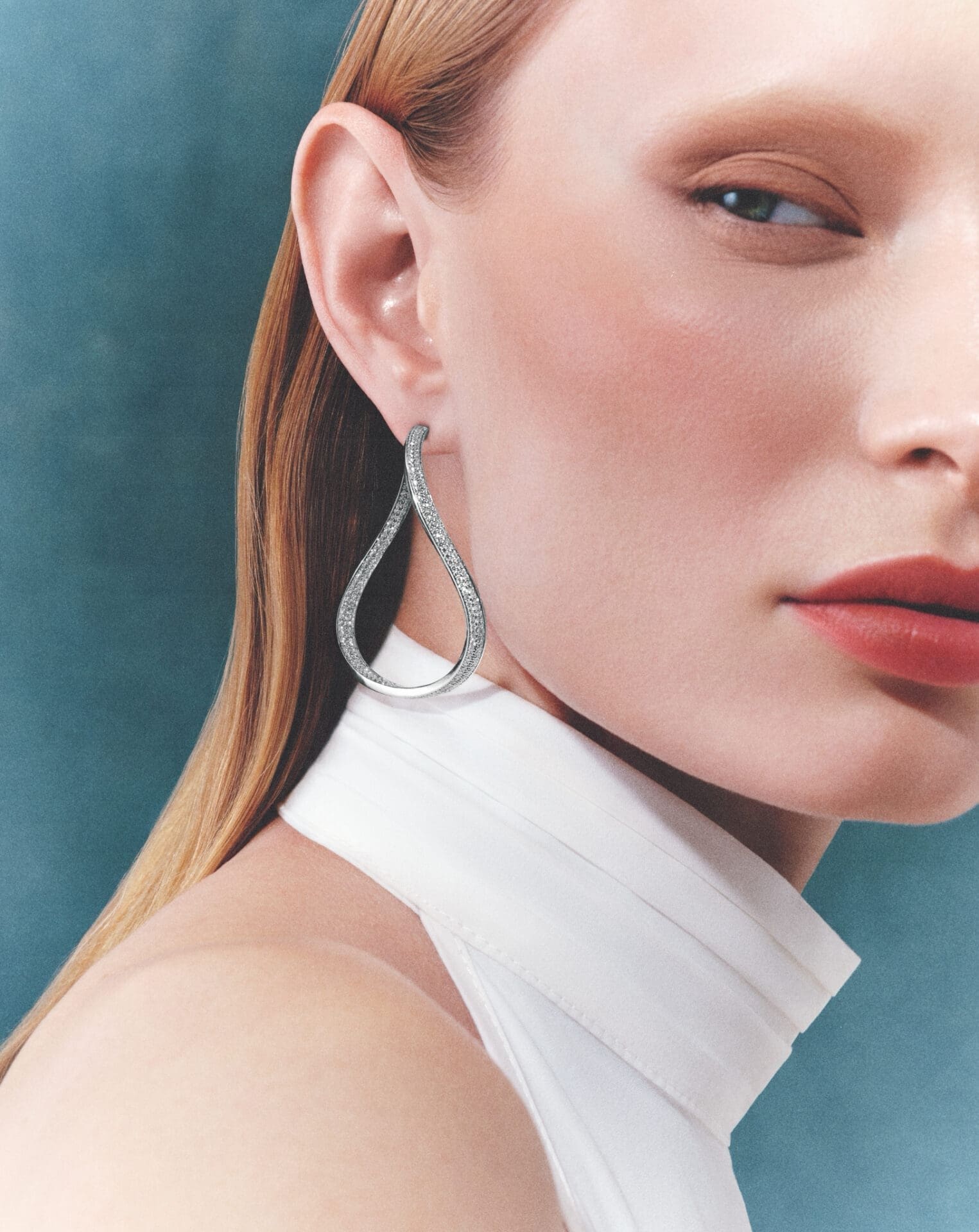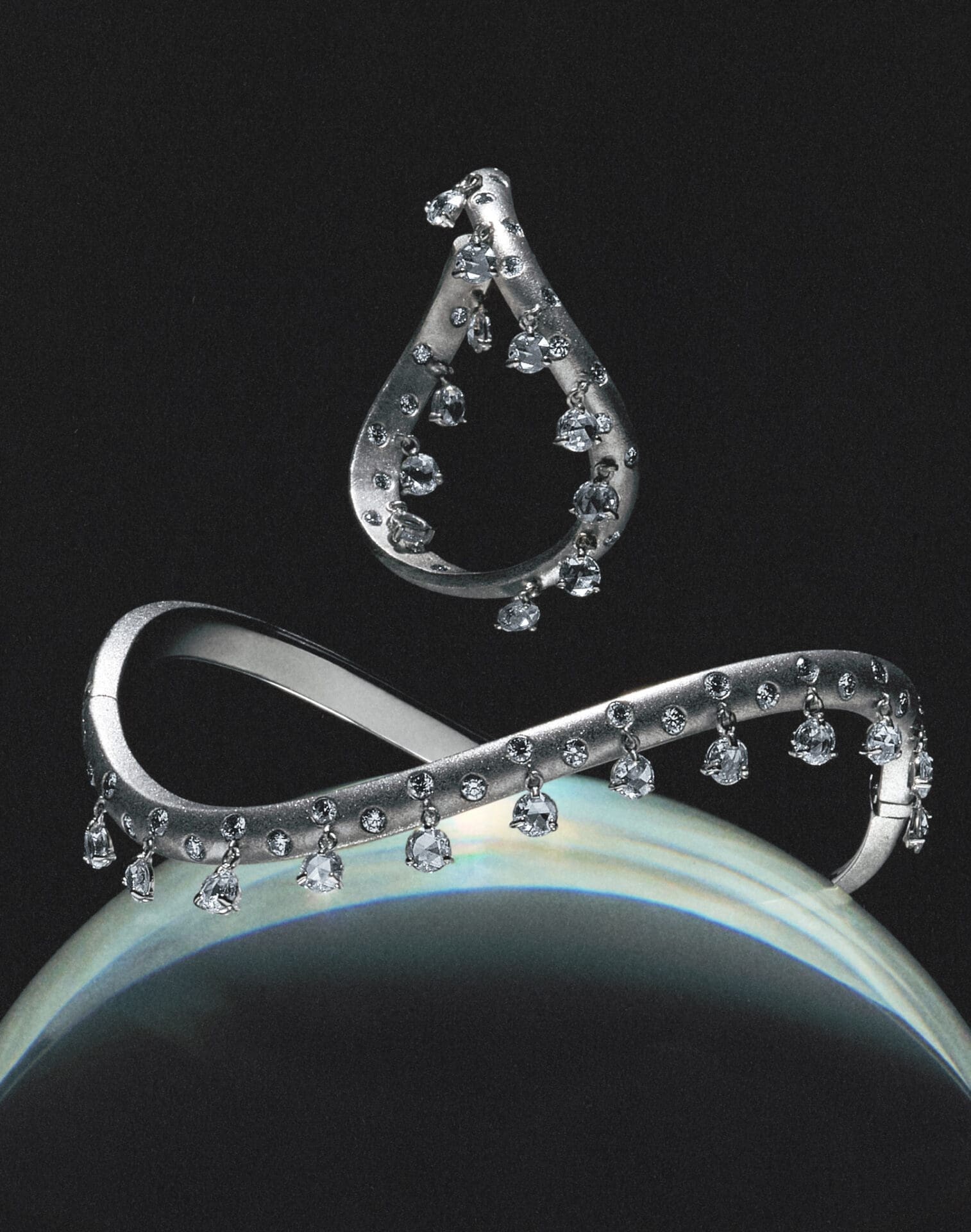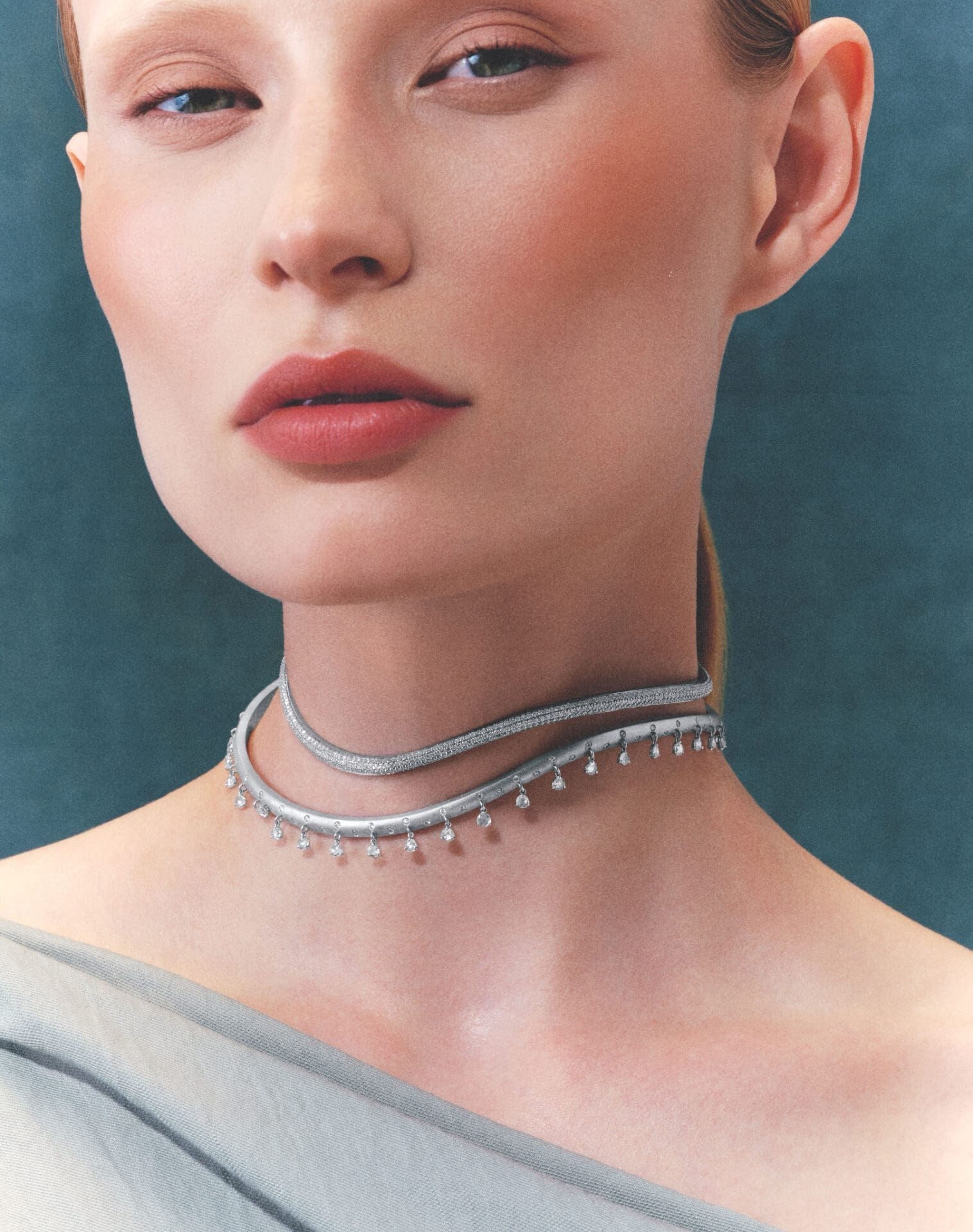 Standout pieces like the Swaying Line, adorned with rose-cut diamond drops that catch the light with every movement, encapsulate the collection’s essence—a playful yet refined spirit that speaks to freedom and fluid grace. Polished surfaces meet matte textures, delicate lines curve with intention, and whimsical diamond dots punctuate forms that feel as natural as breath and heartbeat.