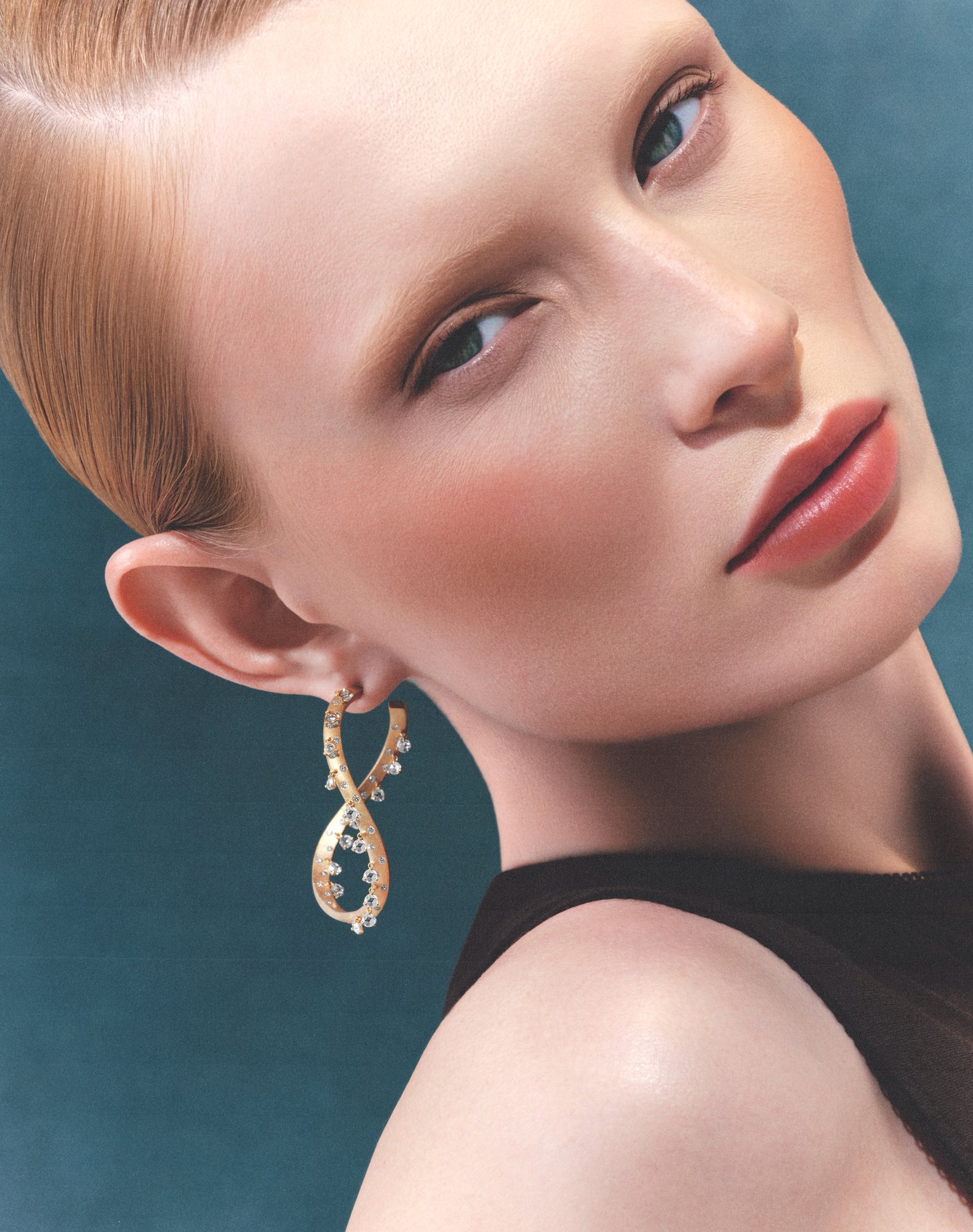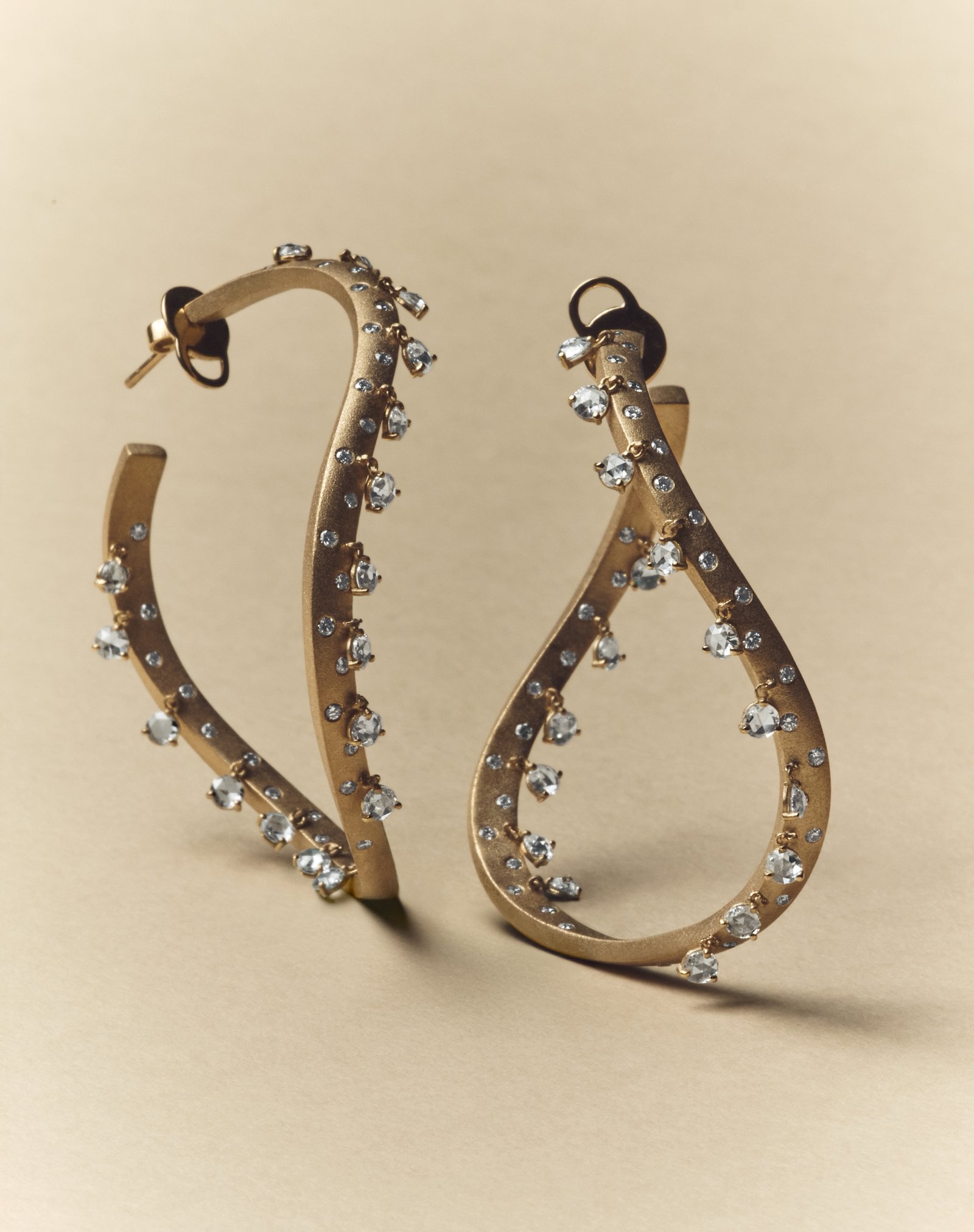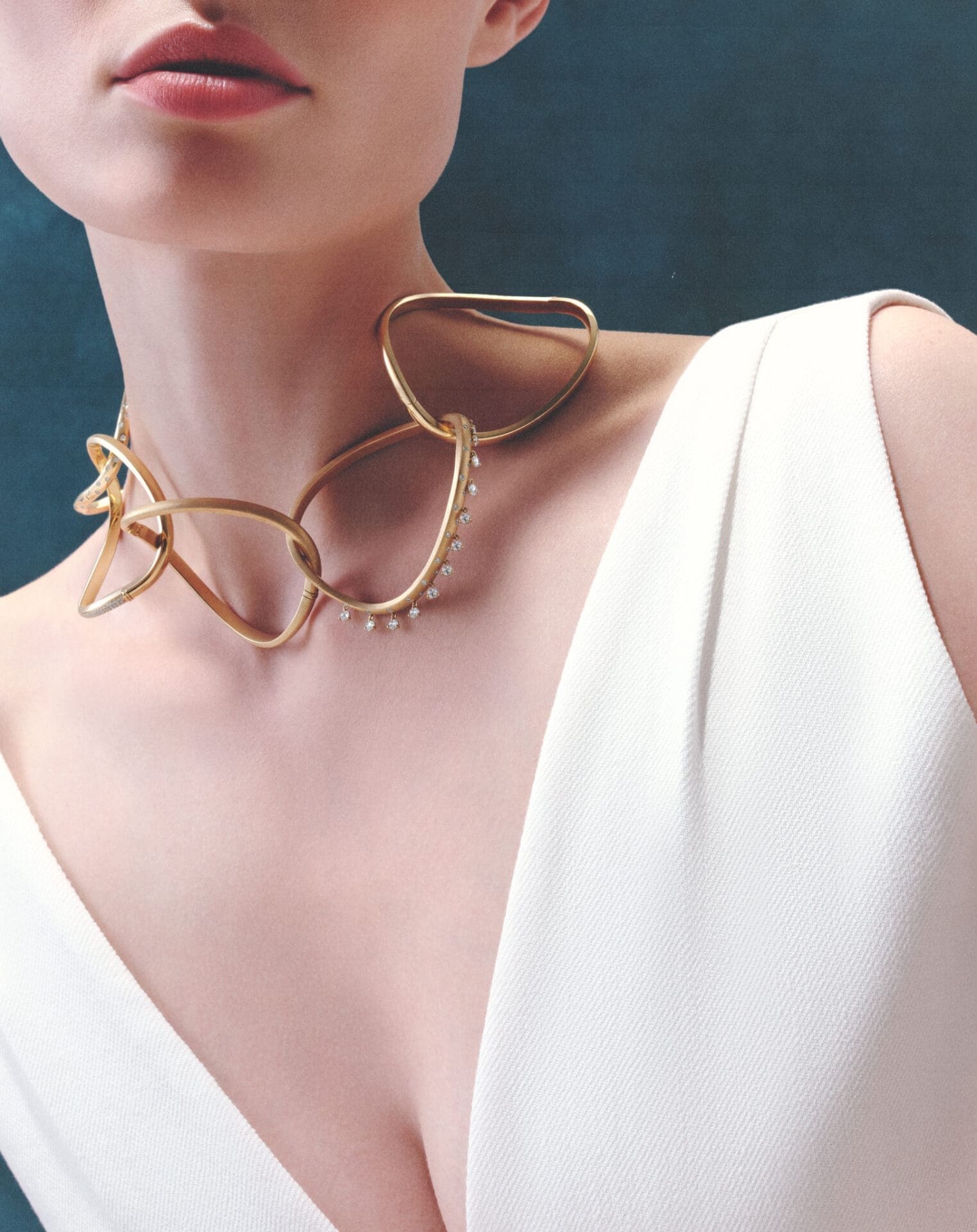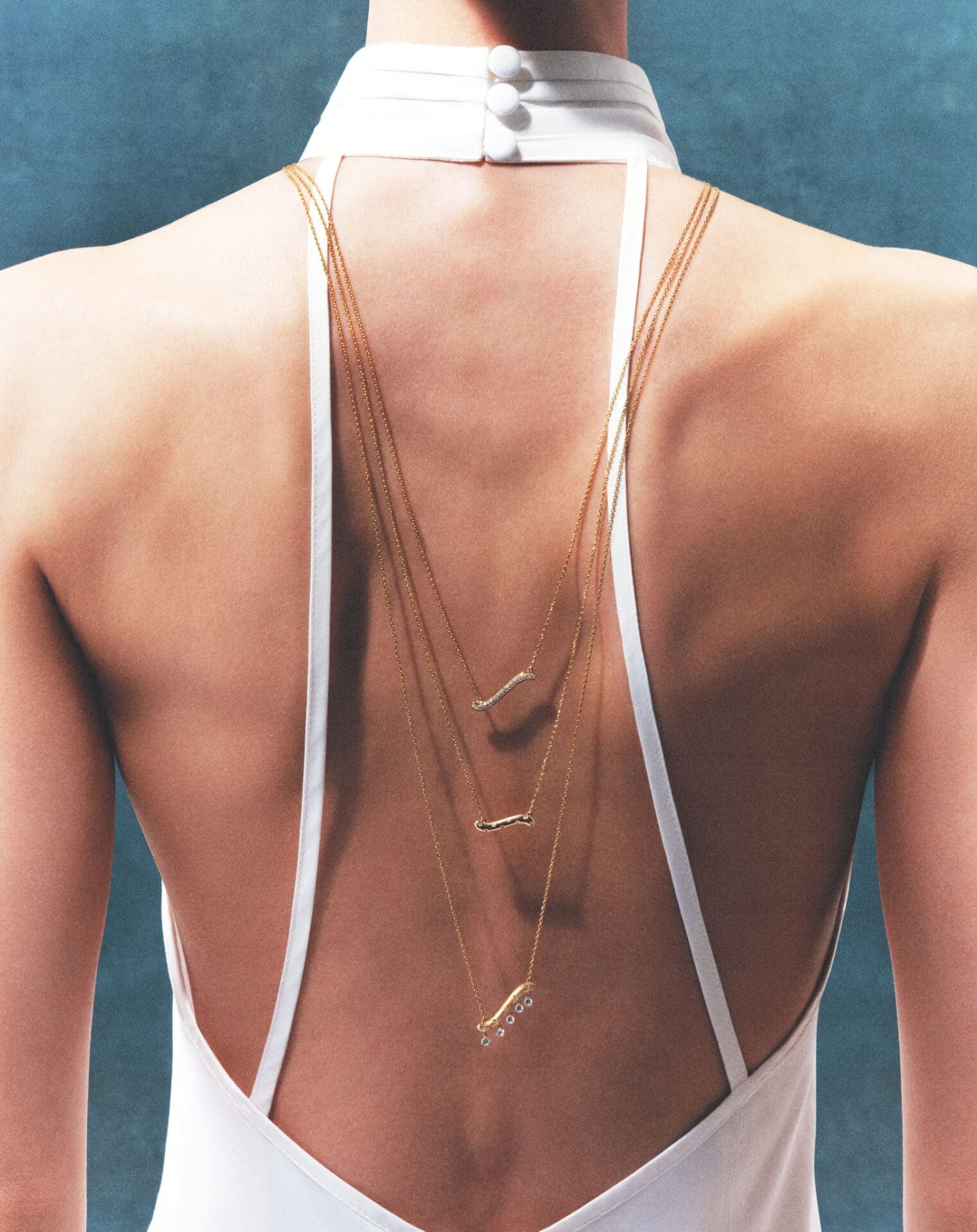 Standout pieces like the Swaying Line, adorned with rose-cut diamond drops that catch the light with every movement, encapsulate the collection’s essence—a playful yet refined spirit that speaks to freedom and fluid grace. Polished surfaces meet matte textures, delicate lines curve with intention, and whimsical diamond dots punctuate forms that feel as natural as breath and heartbeat.