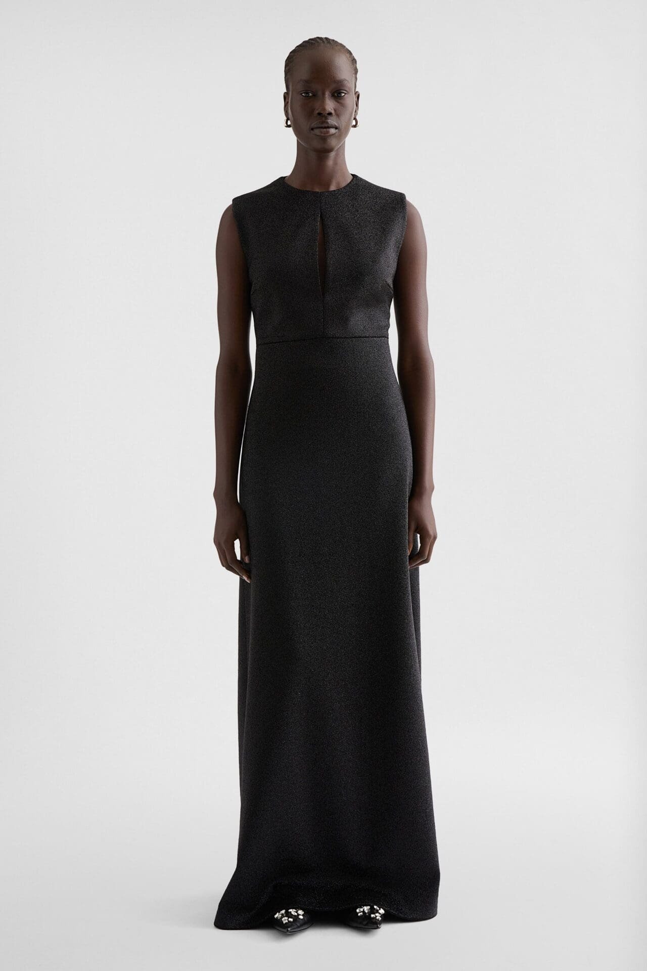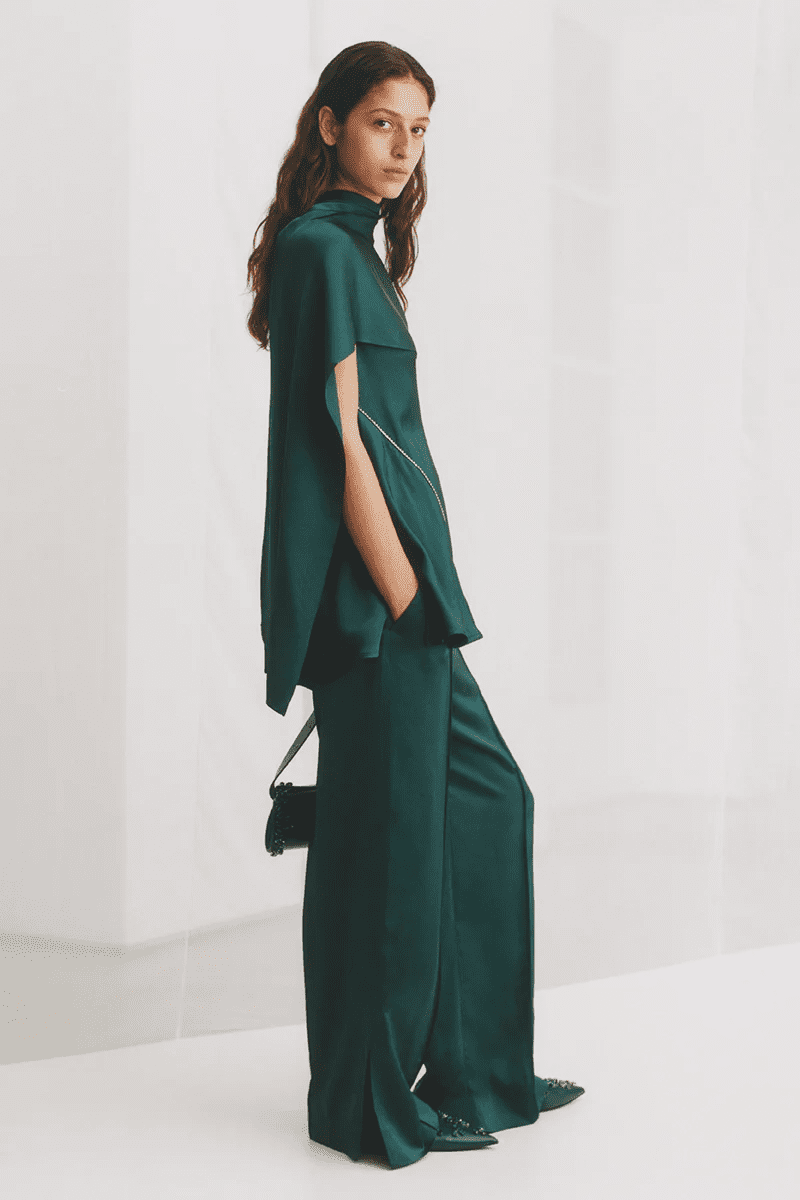 Silhouettes unfold through elongated sleeveless dresses defined by asymmetric lines and diagonal cuts that echo natural movement. One piece is finished with a detachable jewel bow, introducing a discreet moment of ornamentation. Another dress, alongside a coordinated top and relaxed trousers, incorporates refined metal chain detailing, enabling fluid transitions from day to evening.