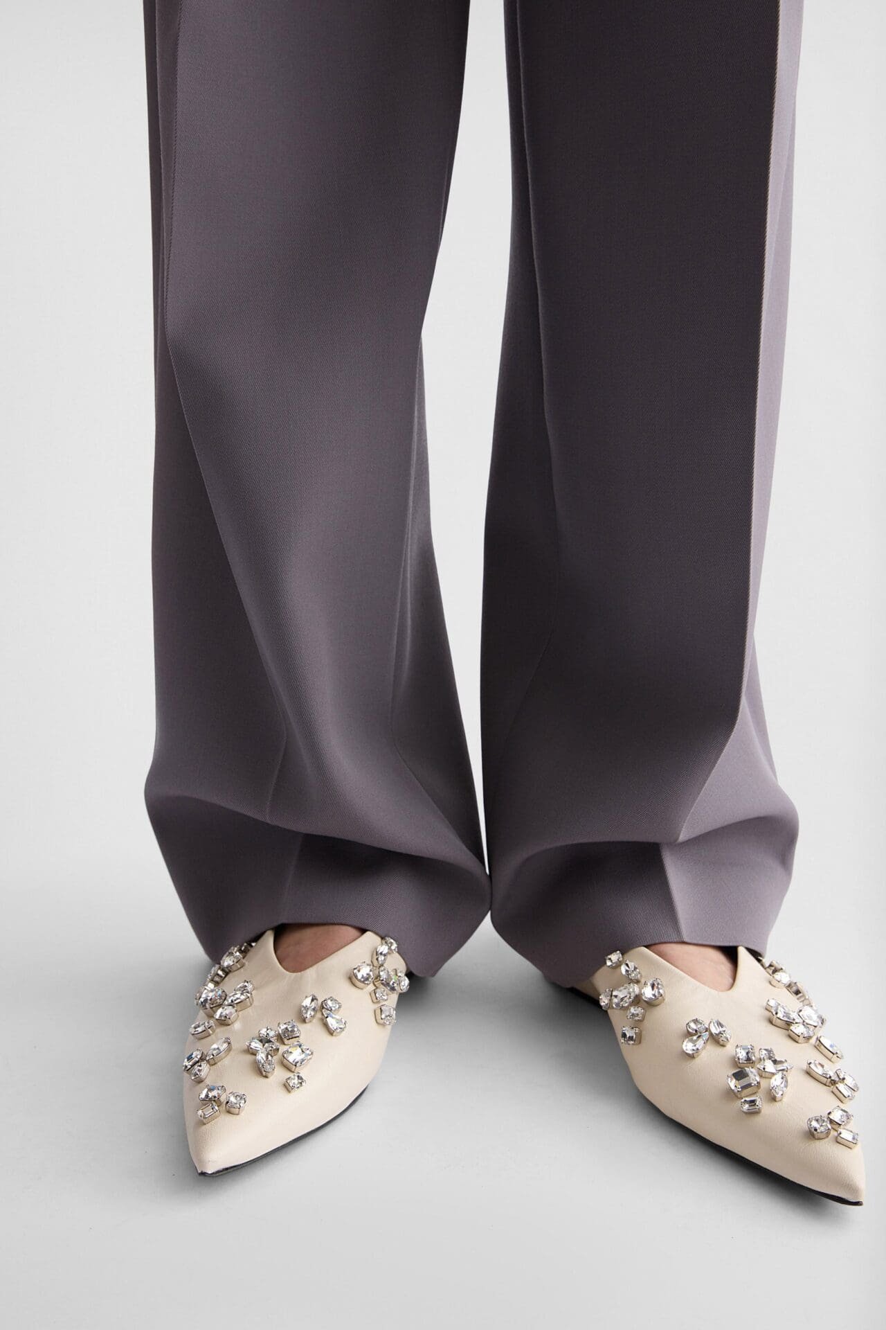 Footwear further elevates the edit with a pointy ballerina crafted in goat leather and accented with strass, adding a gentle shimmer to the otherwise restrained composition. A lightweight shawl in tonal beetle completes the selection, embroidered with a subtle monogram that underscores the brand’s meticulous attention to detail.