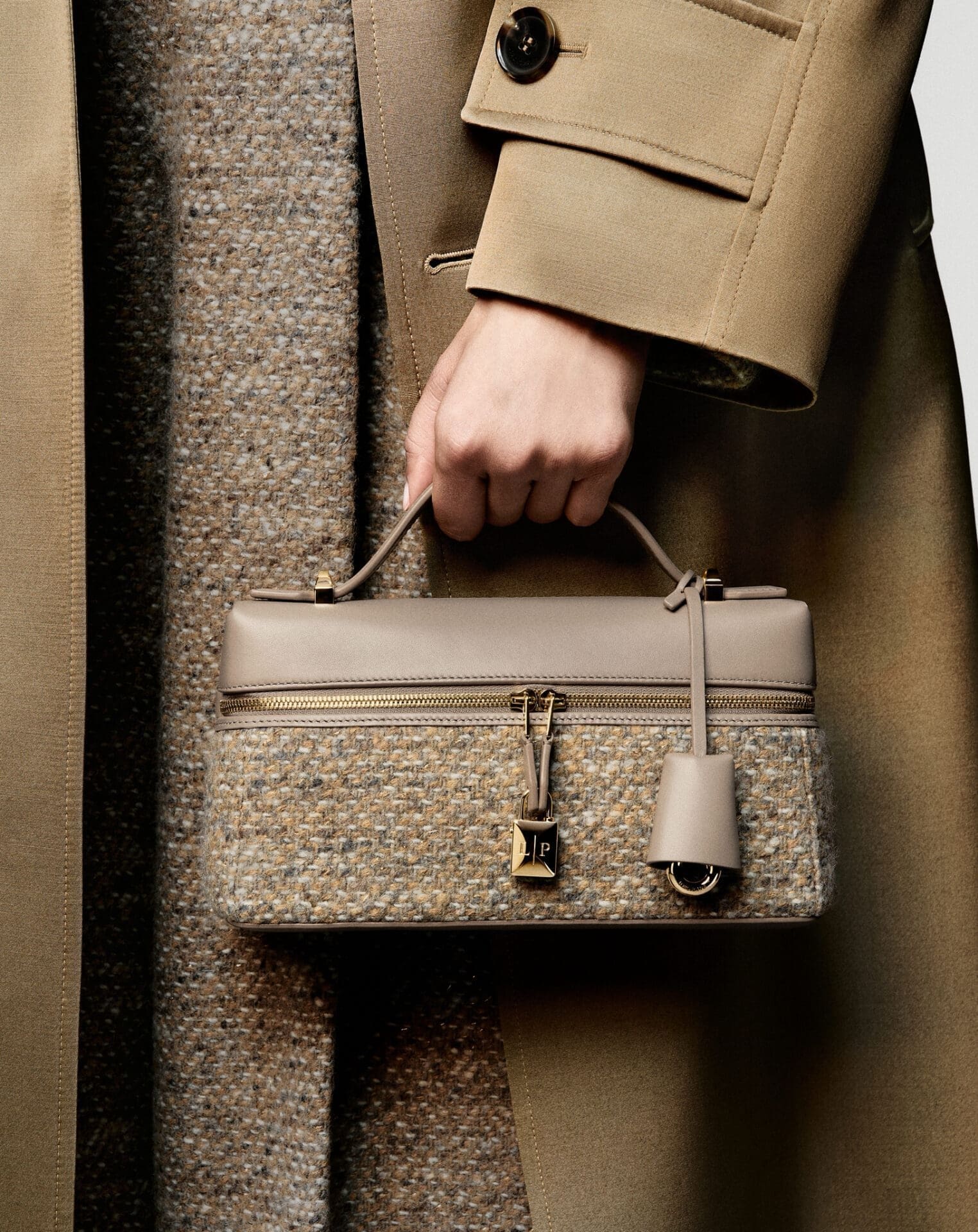 Every iteration of the Extra Bag L23 tells a seasonal story through materials and palette. For Fall/Winter, the Maison presents tactile leathers in refined shades of Deep Kummel, Sunday Morning, Dove, Light Mastic, Blue Navy, and Burnt Tan, alongside a tweed version in Dove that nods to sartorial tailoring. The pièce de résistance is zibeline leather—crafted to echo Loro Piana’s storied Zibeline® fabric—available in Dark Chocolate Licorice, Toffee, and Black, a textural homage to the Maison’s textile heritage.