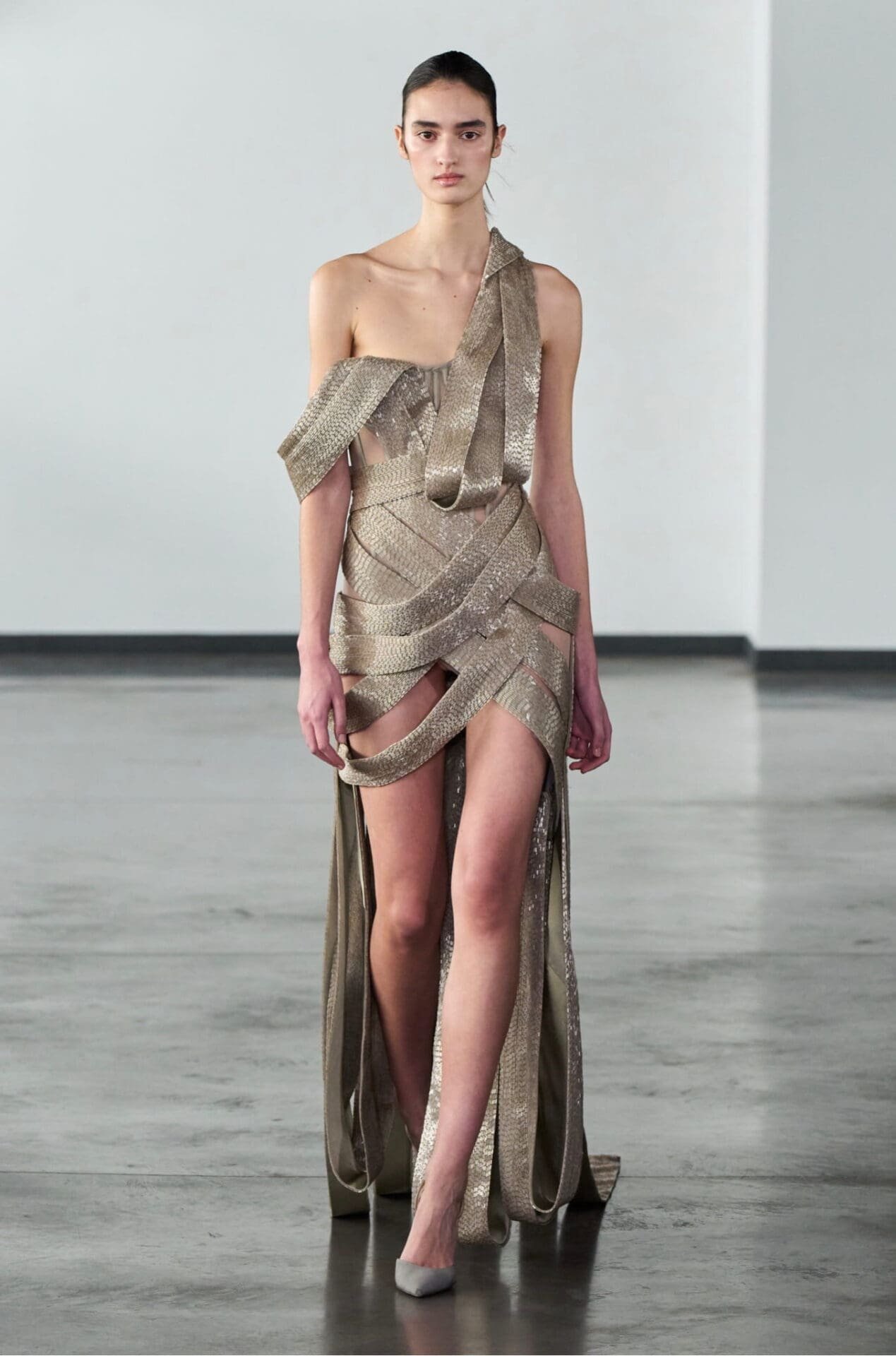 Movement defines the soul of the collection, with garments designed to breathe and evolve with the body. Silhouettes elongate, dissolve, and softly reassemble, creating a sense of motion that feels almost meditative. Couture here is not static or ceremonial, but alive, inviting the wearer into a slower, more contemplative rhythm.