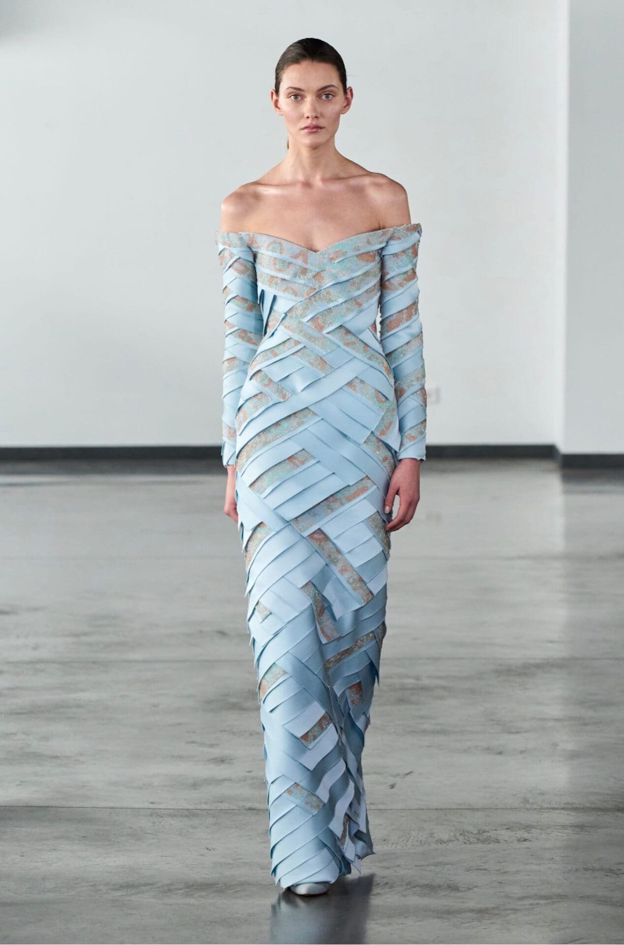 With Fragments in Harmony, Rami Al Ali offers a couture collection that embraces contrast as a path to unity. Repair becomes creation, and softness becomes strength. It is a quietly powerful statement on resilience and elegance, rendered through light, movement and a deeply poetic understanding of modern femininity.