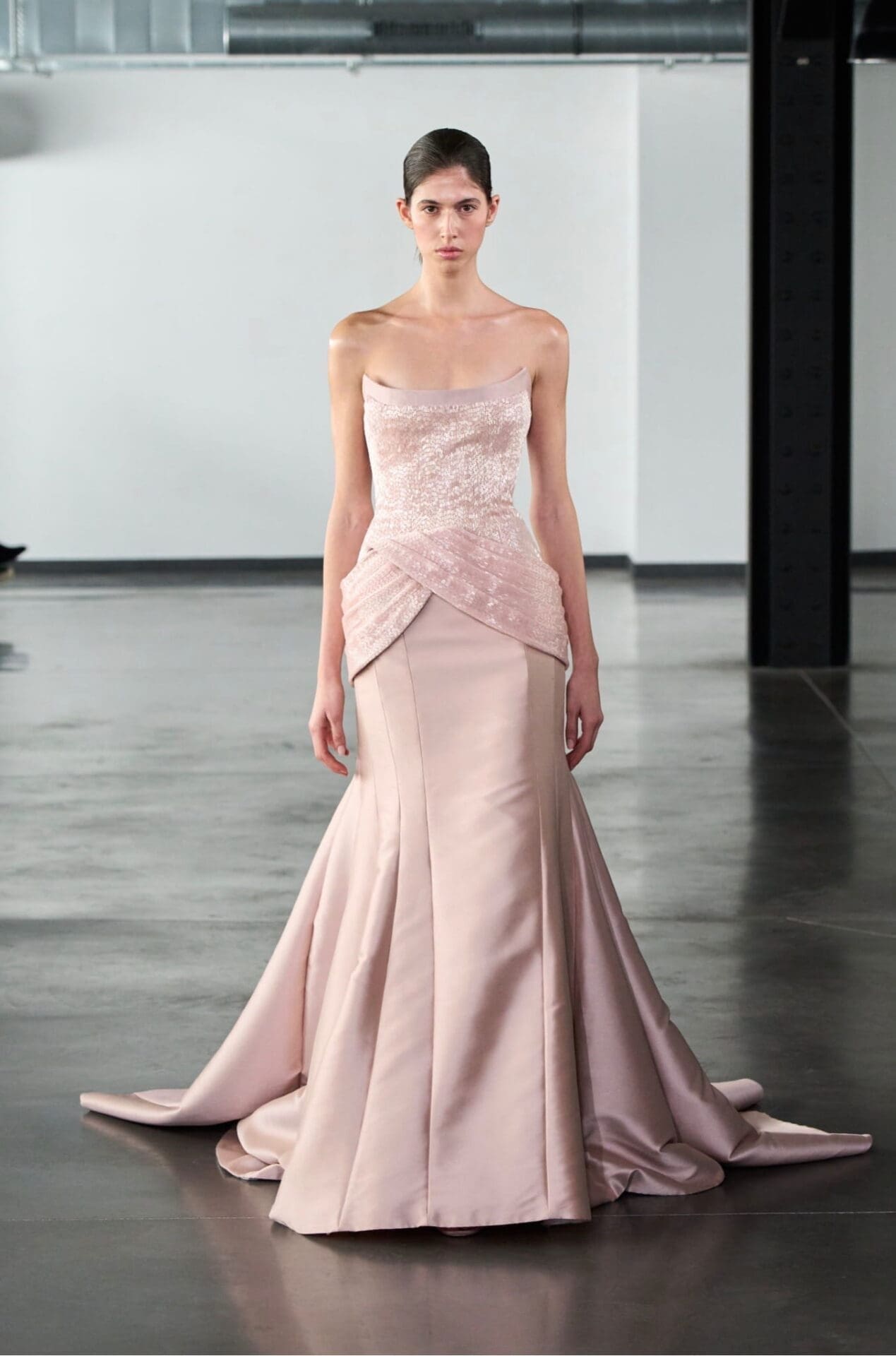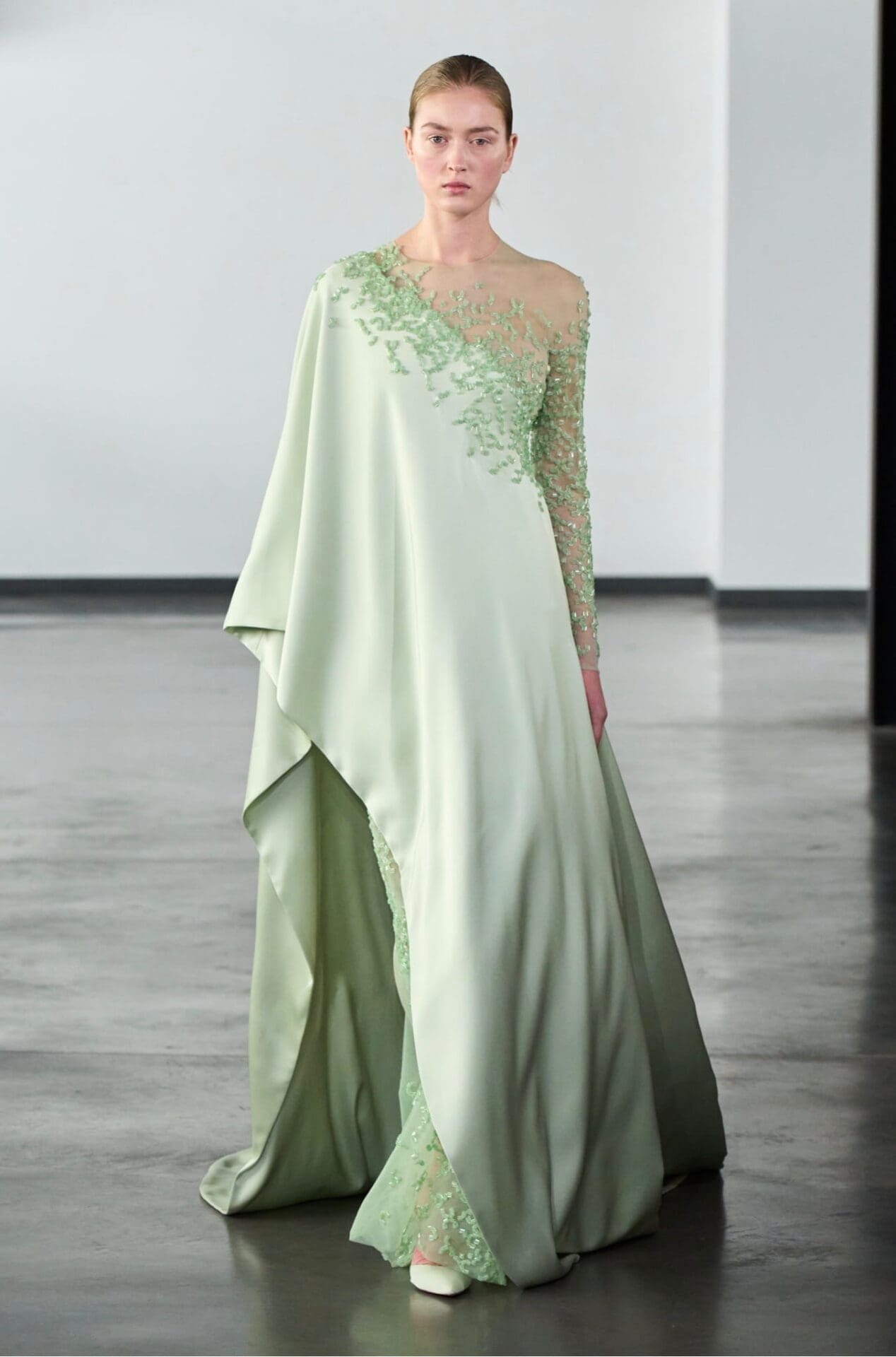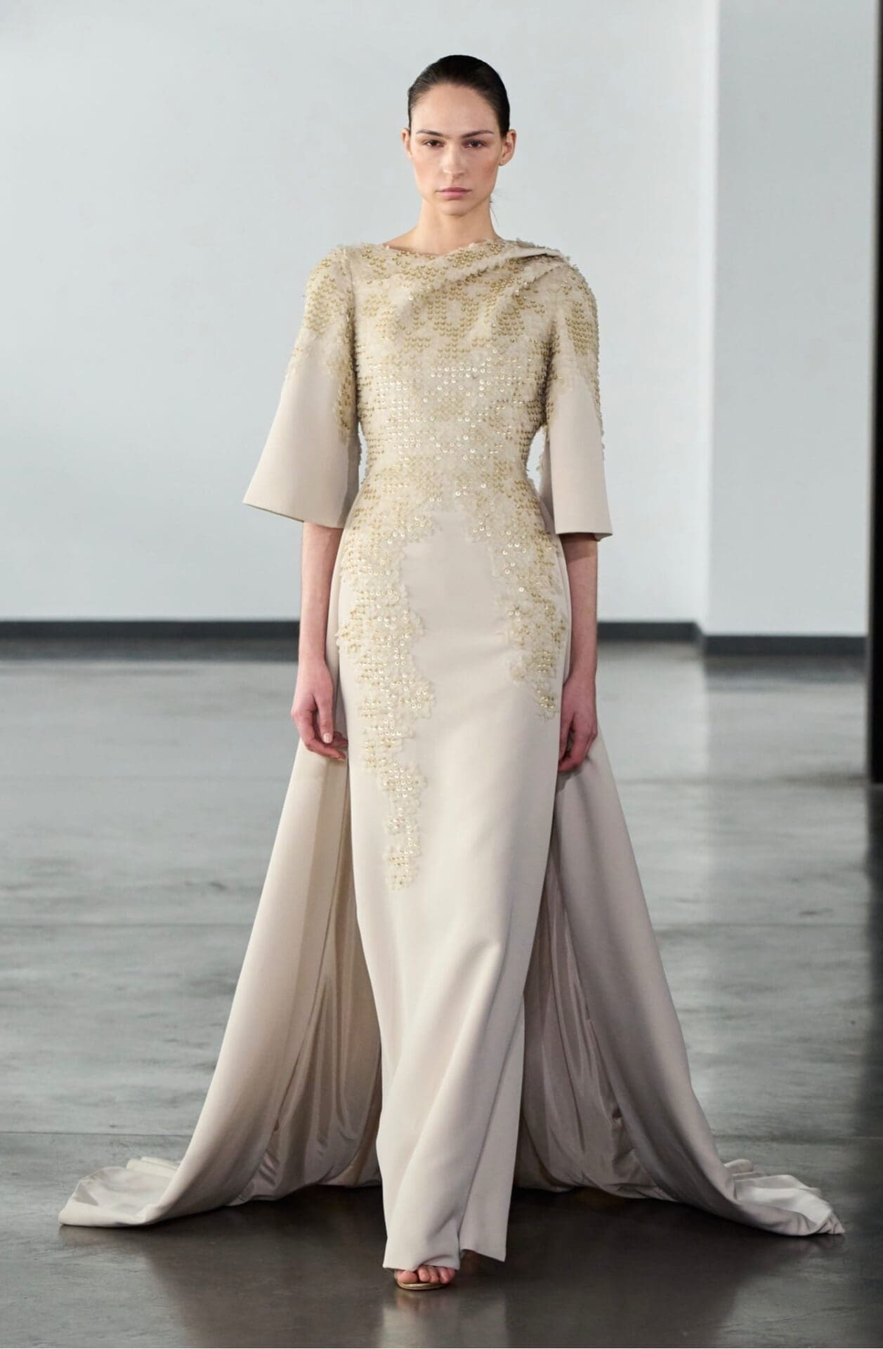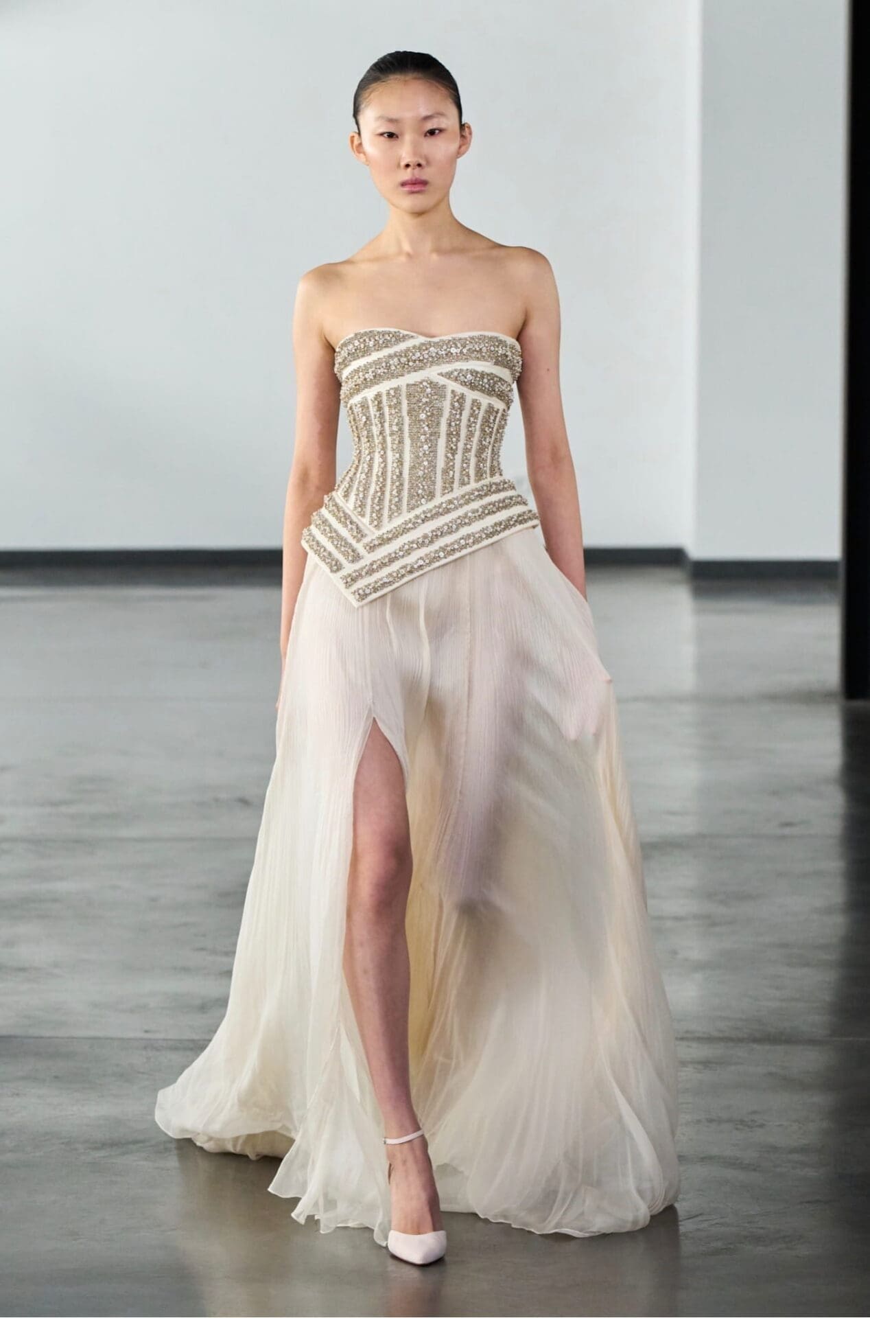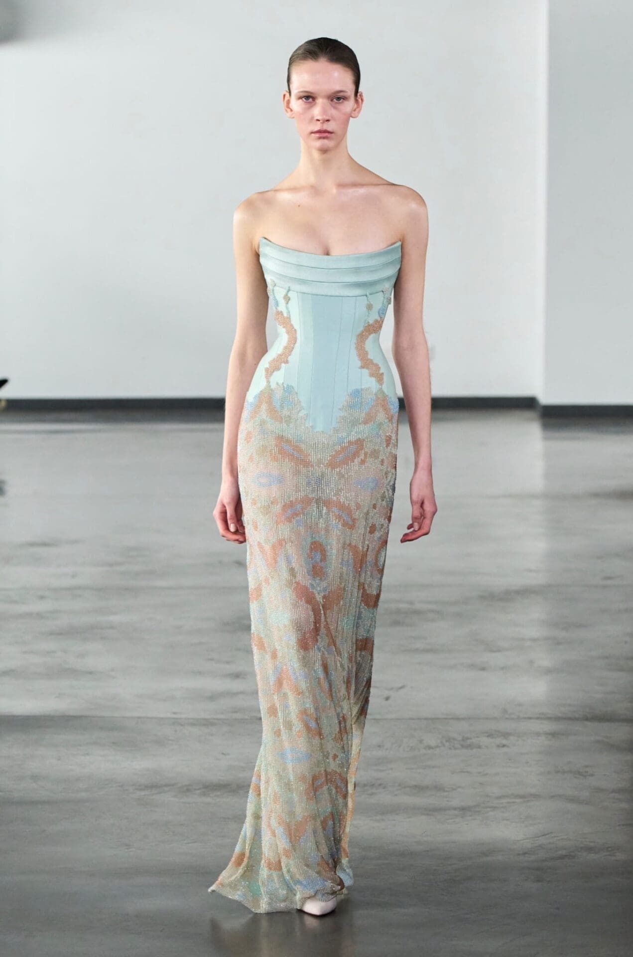 The colour palette unfolds with a luminous restraint, beginning in tones of ivory, alabaster, pale pink and soft peach. As the collection progresses, shades deepen into powdered rose, warm beige, sage green and delicate blue. Accents of gold, pearl, champagne and lilac add gentle radiance, while coral and amber introduce subtle warmth.