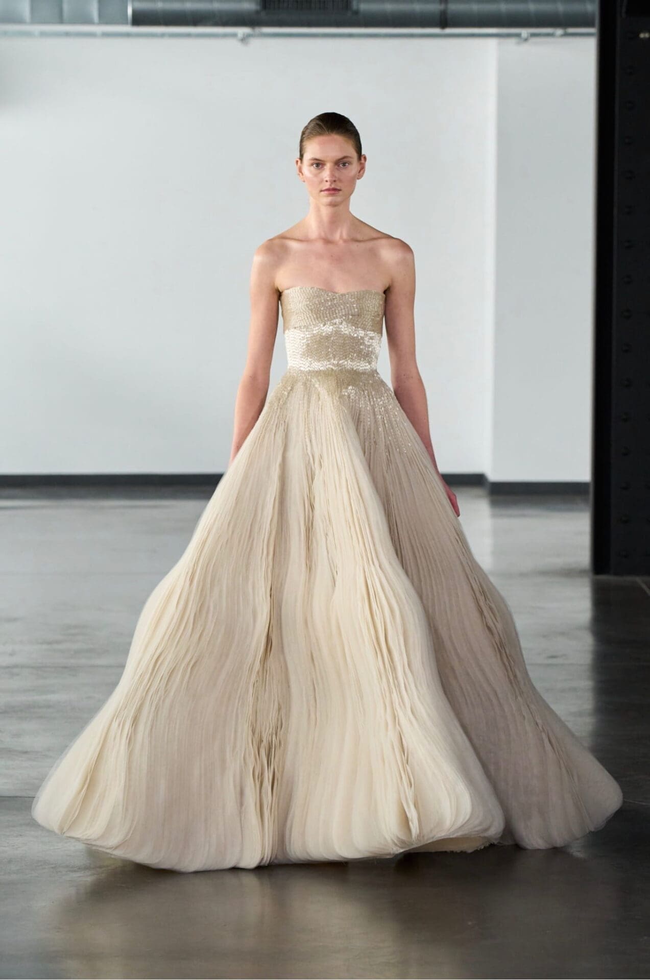 Craftsmanship plays a central narrative role, with embroidery acting as both ornament and meaning. Motifs inspired by broken glass and mosaic patterns are reconstructed through metallic threads, beads and crystals. Lace and organza are layered to create lightness and depth, while visible seams celebrate the act of assembly and the beauty of repair.