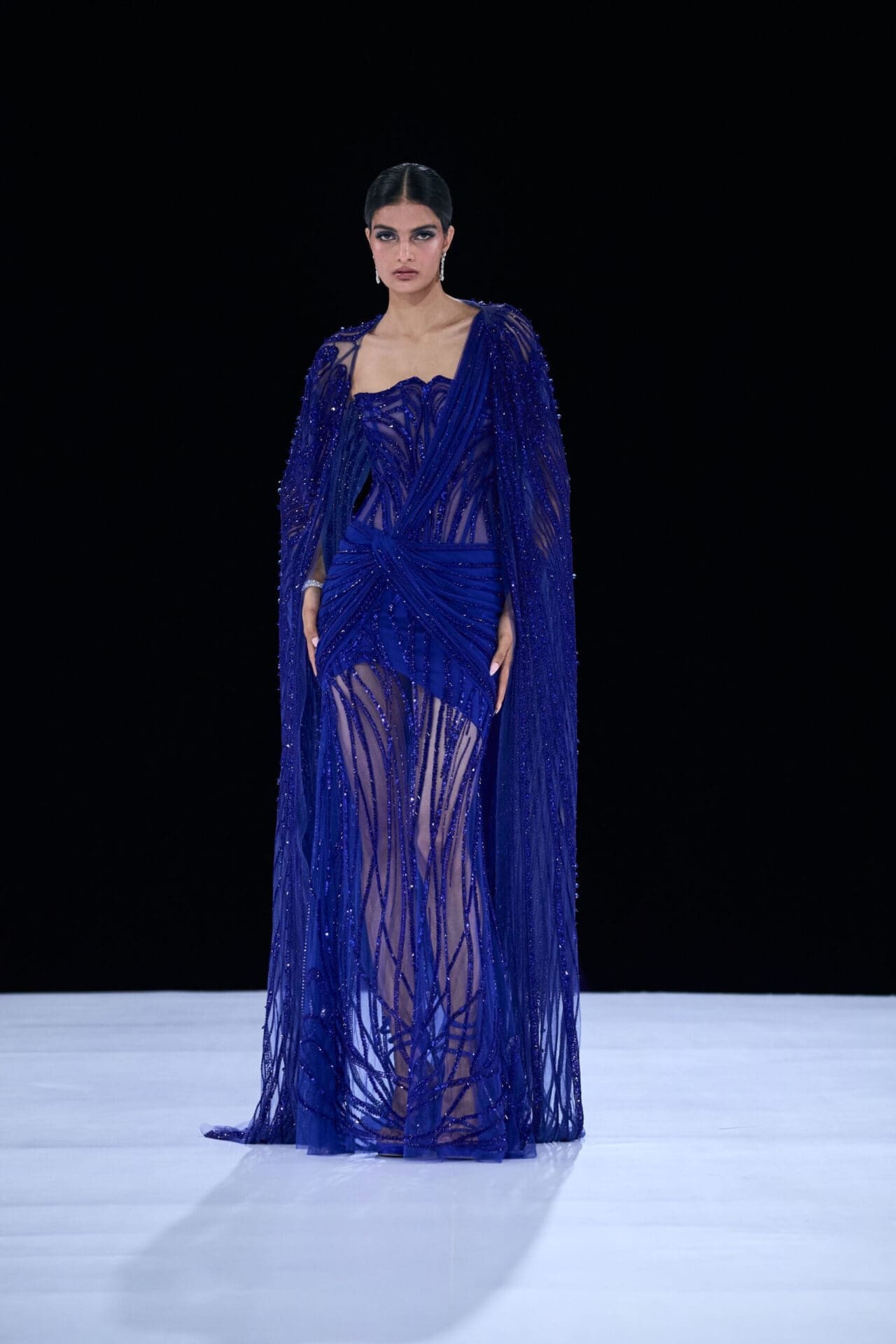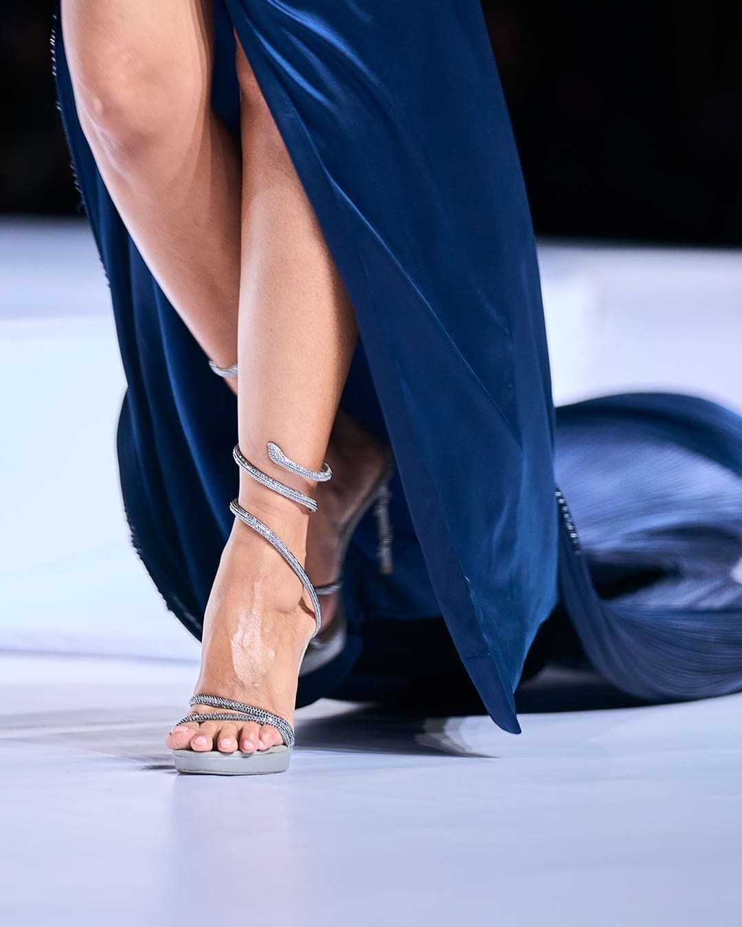 Adding bold drama to the runway, the Margot sandal took on a new life in daring platform versions. One, in vibrant red satin with a golden crystal-encrusted snake, embodied strength and passion. The other, in electric blue satin with tone-on-tone crystal detailing, radiated a futuristic elegance that mirrored Gupta’s progressive couture aesthetic.