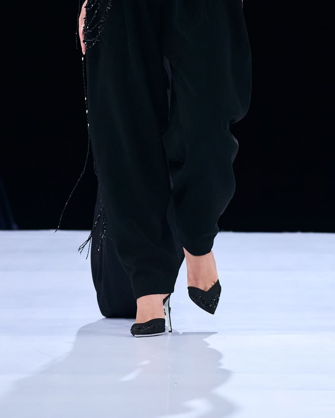 Equally captivating was the Cleo pump, presented in deep black and soft ivory brocade. Embellished with matching crystals, the pump combined sophistication with cultural resonance, perfectly complementing Gupta’s sculptural gowns that redefined the language of Indian couture. Each step taken in these creations seemed to embody the balance of tradition and forward-thinking design.
