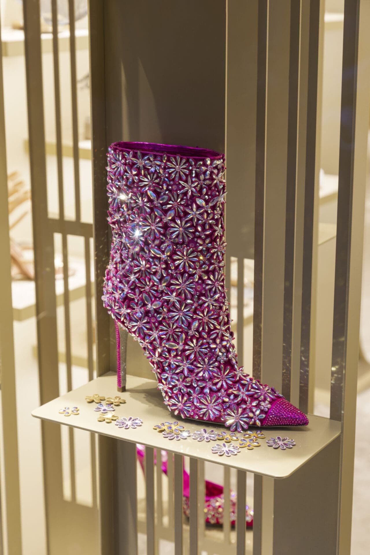 Fuchsia, the chosen colour palette of the collection, takes on symbolic resonance throughout. In the Maison’s hands, it is no longer merely vibrant—it becomes a statement of bold femininity, wild allure, and seductive confidence. Whether adorning a delicately embroidered boot or accentuating the curves of the Jungle SuperCleo sandal, this vivid shade becomes the connective tissue that unifies the collection’s vision, weaving together nature’s unruliness with couture’s formality.