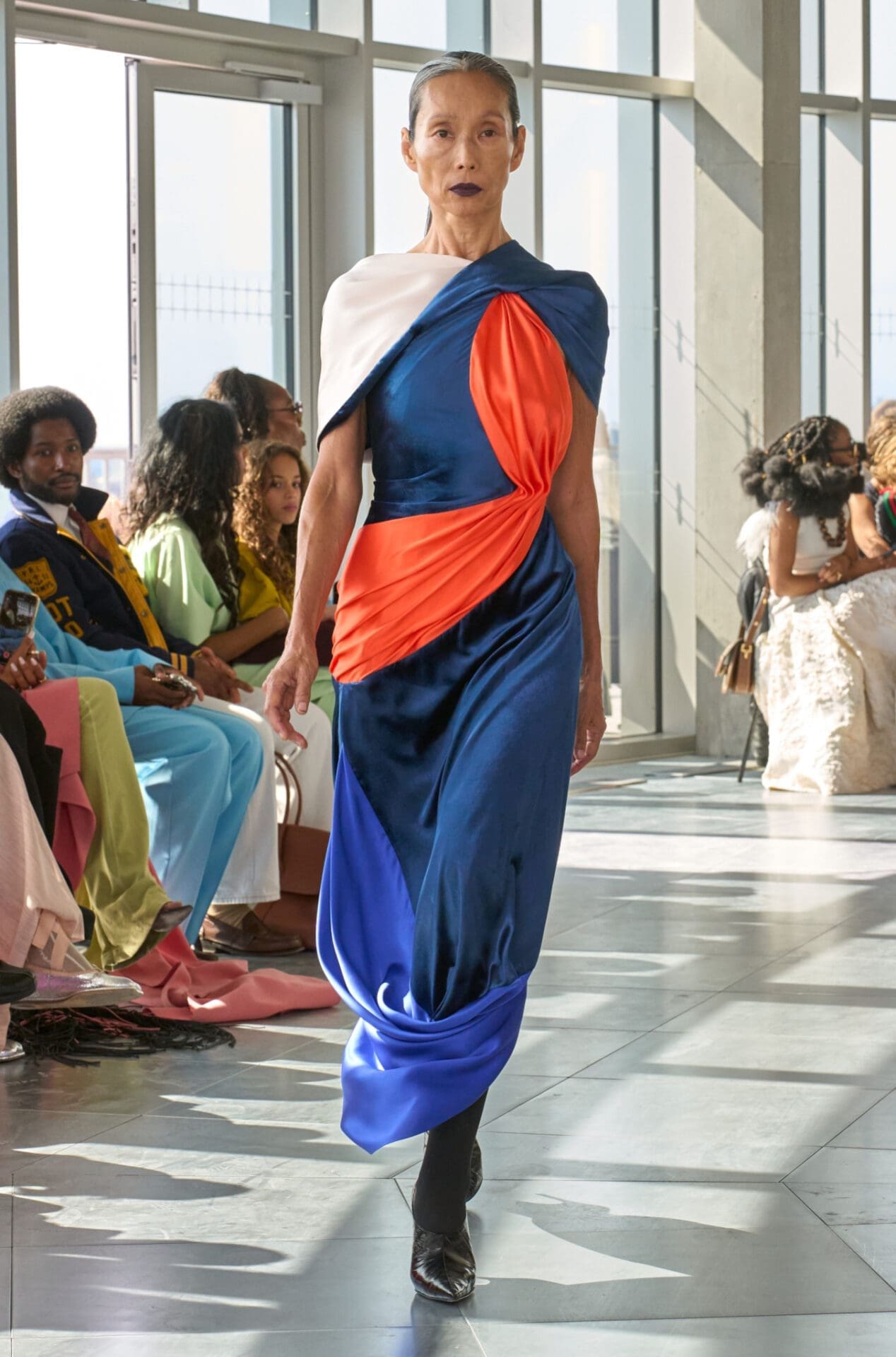 Set within the brutalist yet airy curves of London’s Space House, designed by George Marsh in 1968, the show merges architecture with ideology. The location becomes a fitting metaphor for Denes’ dialogue — organic ideas framed within rigid frameworks — as Roksanda sculpts silhouettes that float, structure, and reveal in equal measure. There’s a deep sense of contrast that permeates the entire collection: softness meeting strength, the body shown and obscured, the familiar transformed.