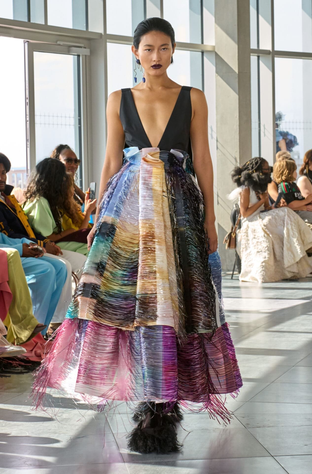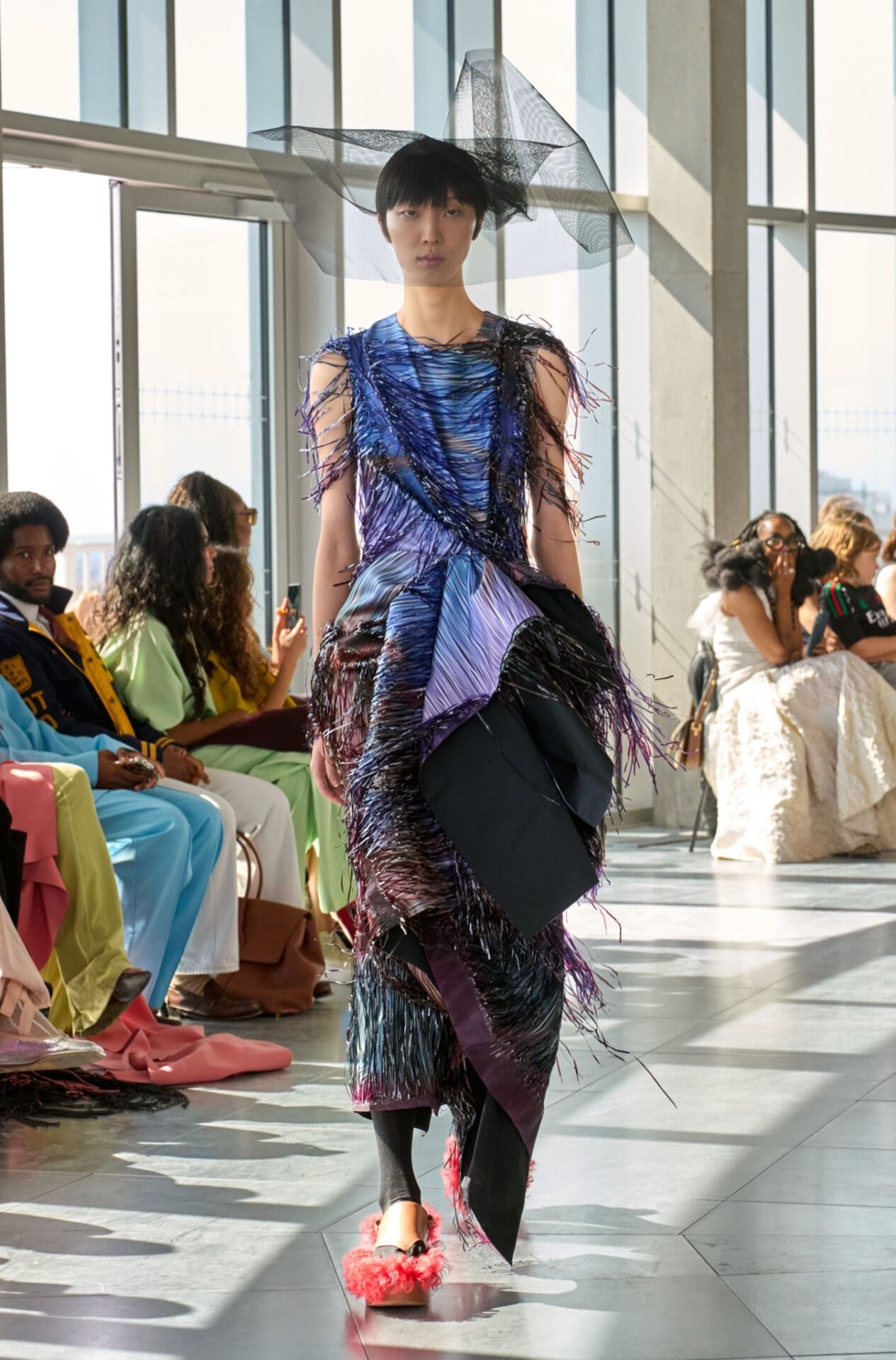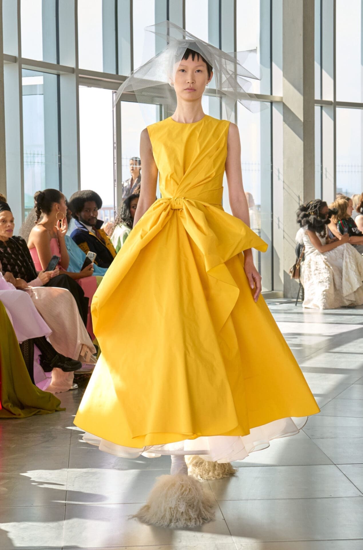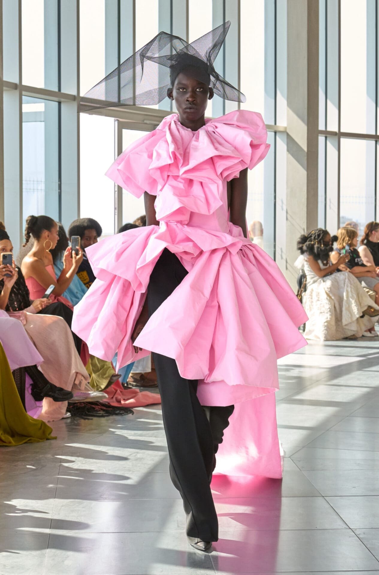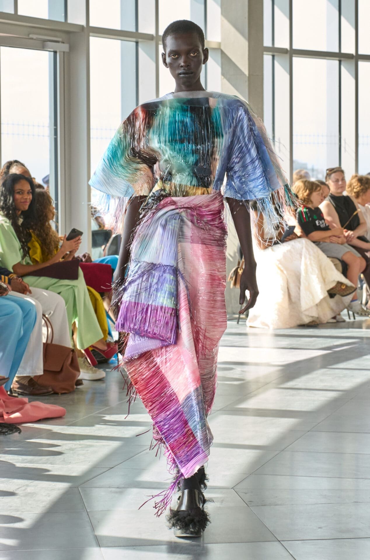 Prints and textures celebrate the designer’s Serbian roots, with references to Belgrade and the dual rivers of Sava and Danube, symbolising heritage and fluidity. A tactile raffia fil-coupé evokes images of harvests, while hand-pleated recycled taffeta forms floral-inspired volumes, drawing a direct line between craftsmanship and the natural world.