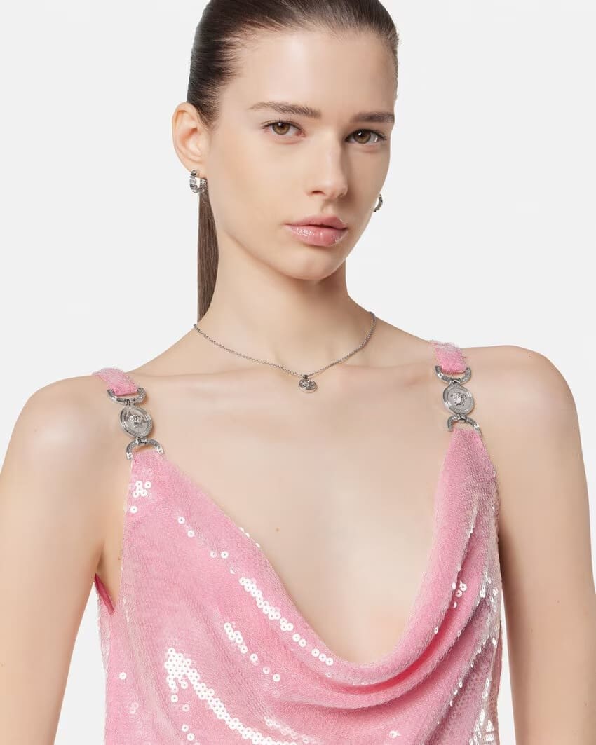From sequinned silk to sculptural accessories, the collection pulses with energy and texture drawn straight from the ocean. The standout Sequin Silk Slip Mini Dress (AED 16,600) is a show-stopping nod to siren style, with its liquid silk chiffon and scale-like sequins that shimmer with every step. Draped in a cowl neckline and secured with silver-toned Medusa ’95 hardware, it’s a modern interpretation of classic Versace seduction.