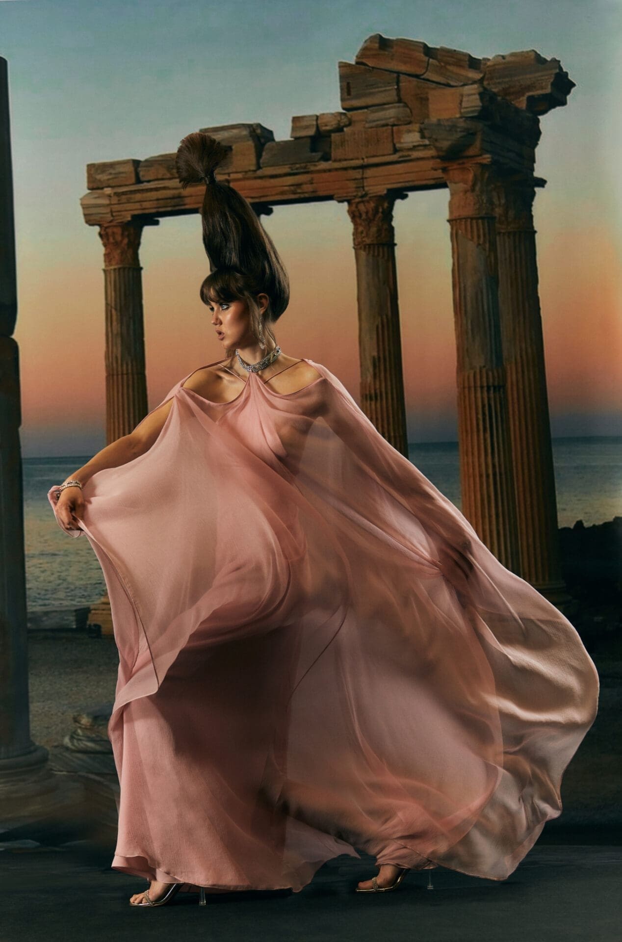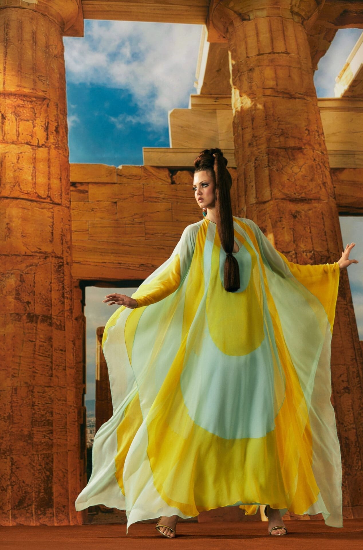 Color plays a starring role in this narrative of travel-ready glamour. Sheer layers shimmer in golden tones, while citrus hues and soft pastels bring vibrancy to breezy fabrics. Aqua, lemon, blush, black, and lavender weave together into a palette that evokes both Mediterranean coastlines and cosmopolitan rooftops. It’s a spectrum that feels optimistic yet timeless, grounded in the brand’s vision of laid-back luxury.
