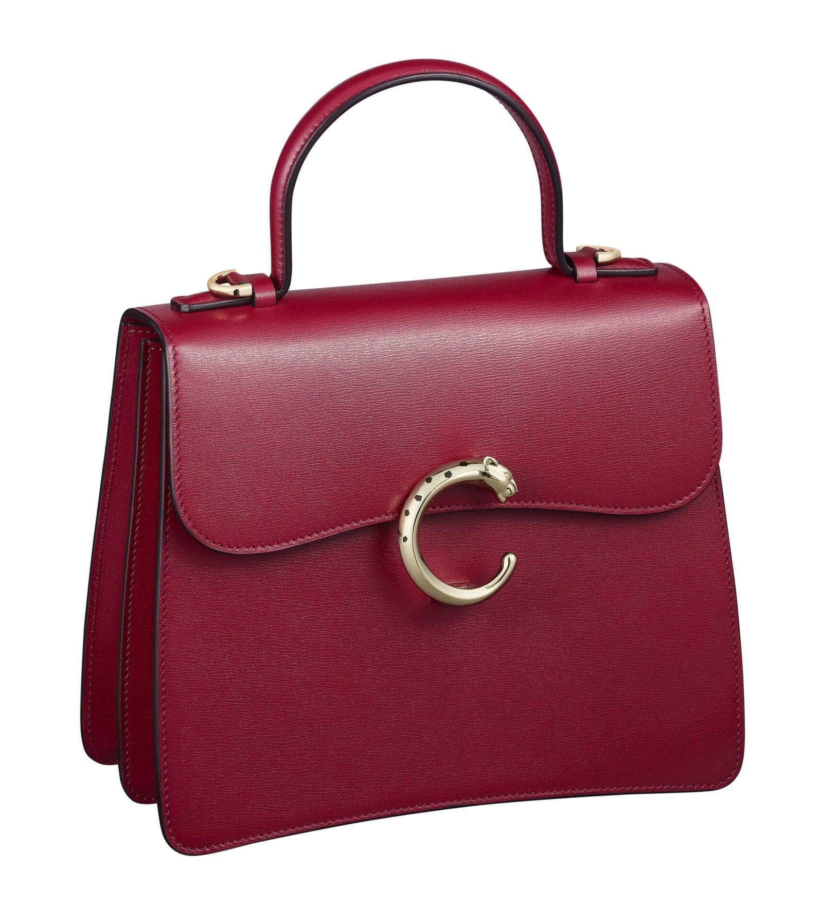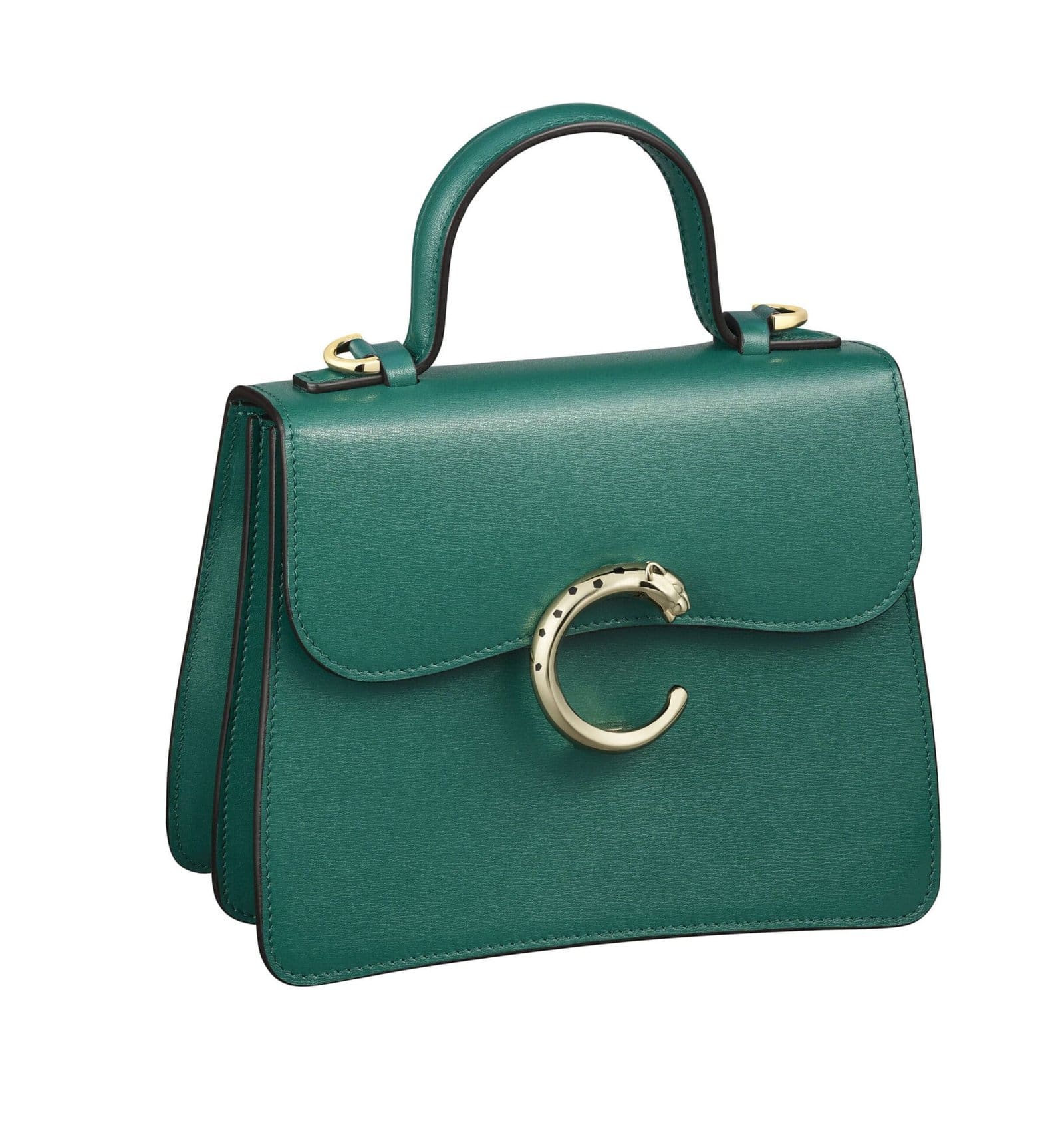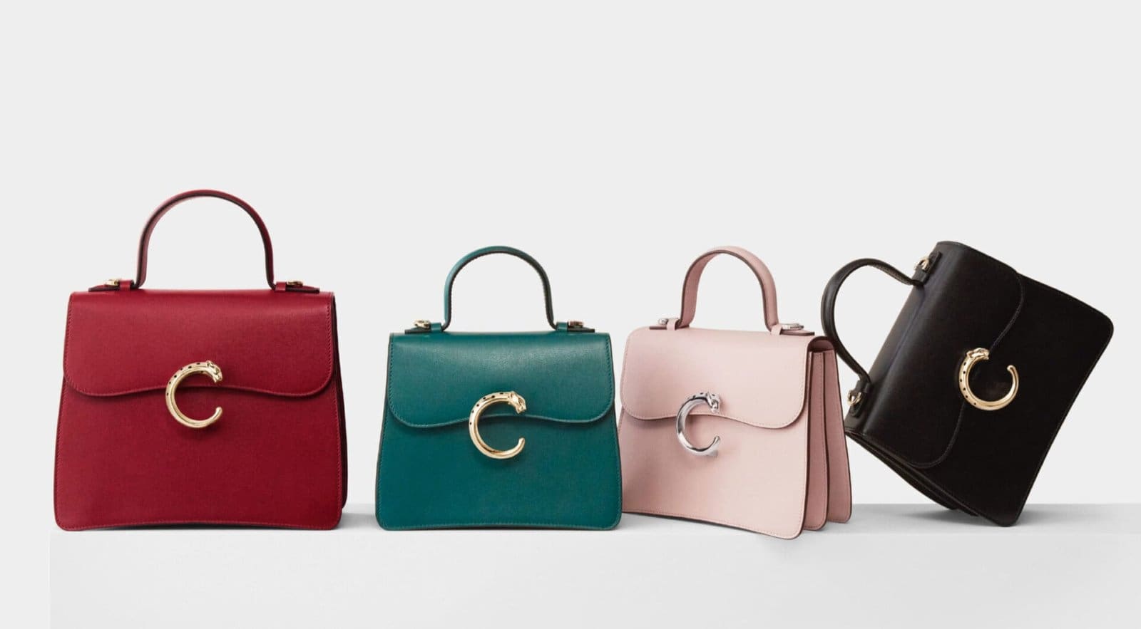 The Panthère de Cartier bag collection features two elegant sizes, a small model and a mini model, available with a top handle. The color palette is rich and classic, including black, red cherry, and a deep dark green calfskin, all accentuated by a golden finish that complements the jewel clasp. This range of options allows for personal expression, ensuring each bag is as unique as the woman who carries it.