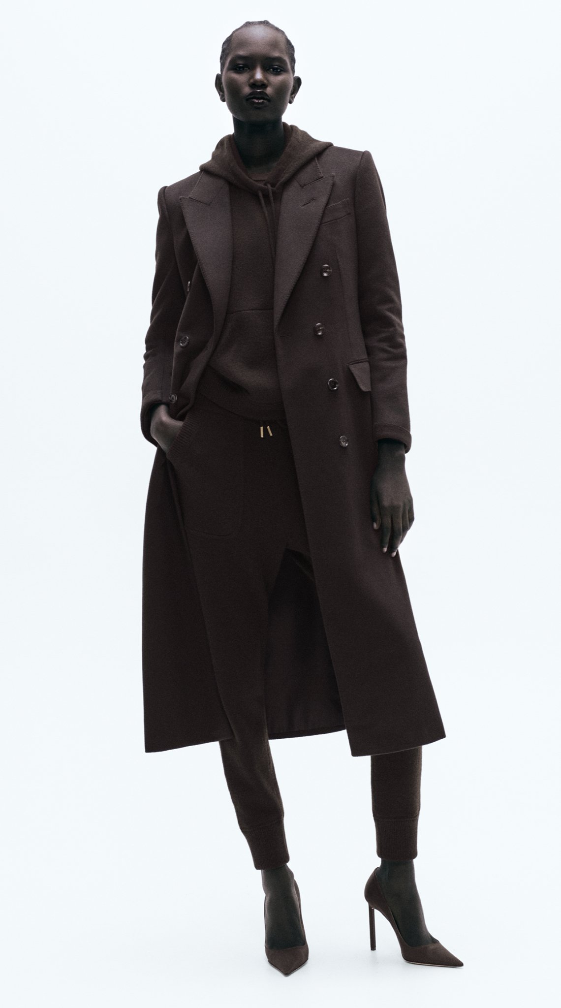 Casual luxury plays a key role, particularly in the snug cashmere tracksuits worn beneath tailored jackets and the resurgence of sweater dressing. These pieces prove that comfort and elegance are no longer mutually exclusive. By merging relaxed silhouettes with refined materials, Tom Ford ensures that even the most laid-back looks carry a sense of occasion.