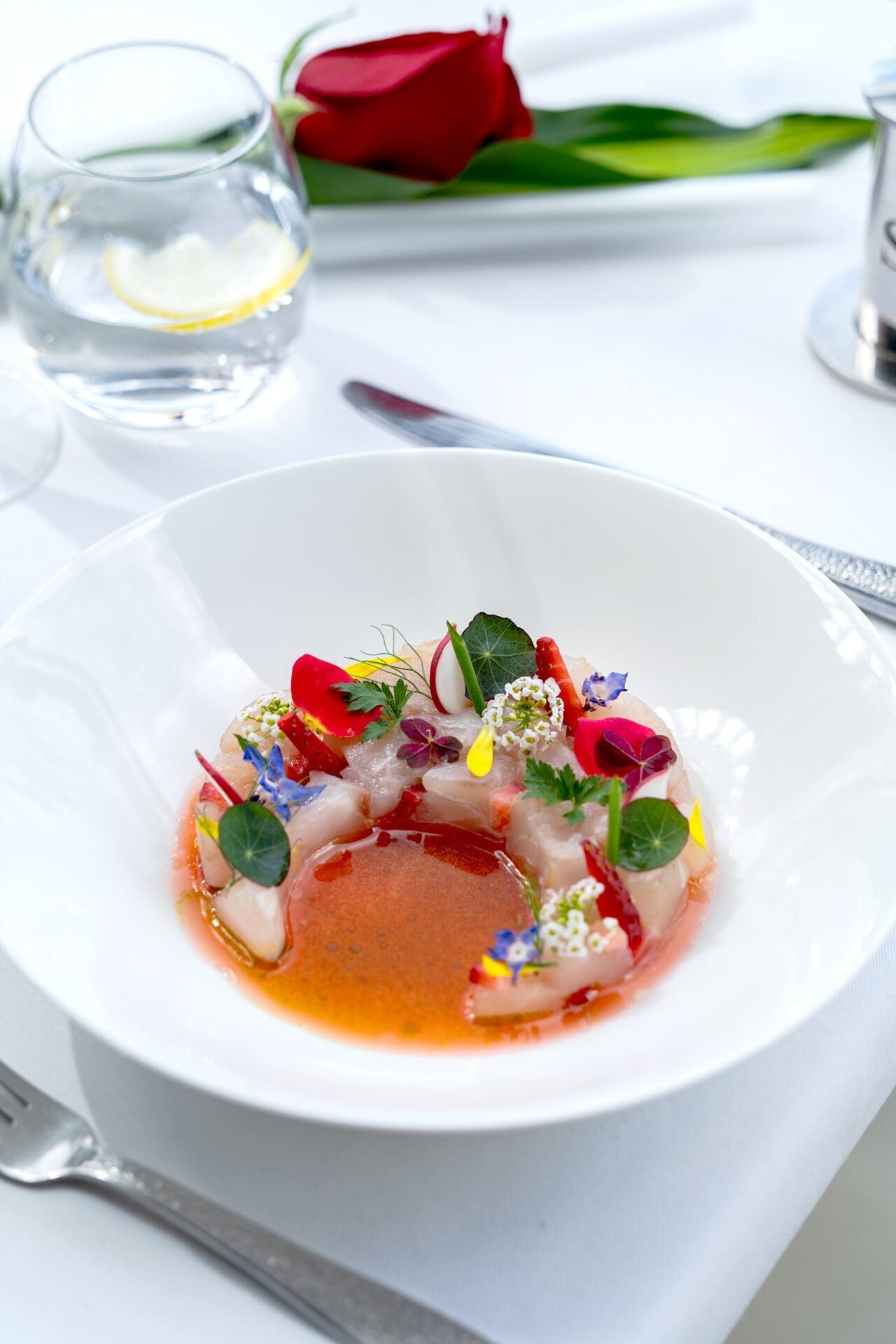 At Armani/Ristorante, the language of romance is expressed through contemporary Italian cuisine. Delicate beginnings give way to richly layered courses, where classic flavours are elevated through restrained technique. The progression of the menu mirrors the pace of the evening itself, unhurried and immersive, concluding with a dessert that feels quietly indulgent.