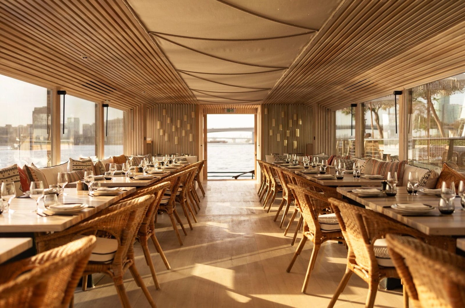 On the water, Lady Nara extends the narrative into a serene Iftar voyage along the creek. Gentle currents and ambient lighting create space for reflection as guests gather around a curated Levantine menu. Green Lentil and Celery Salad with pomegranate dressing, Levantine Tabbouleh and sharing mains such as Kofta and Tomato Tajine and Artichoke with Seasonal Vegetable Tajine unfold with quiet rhythm.