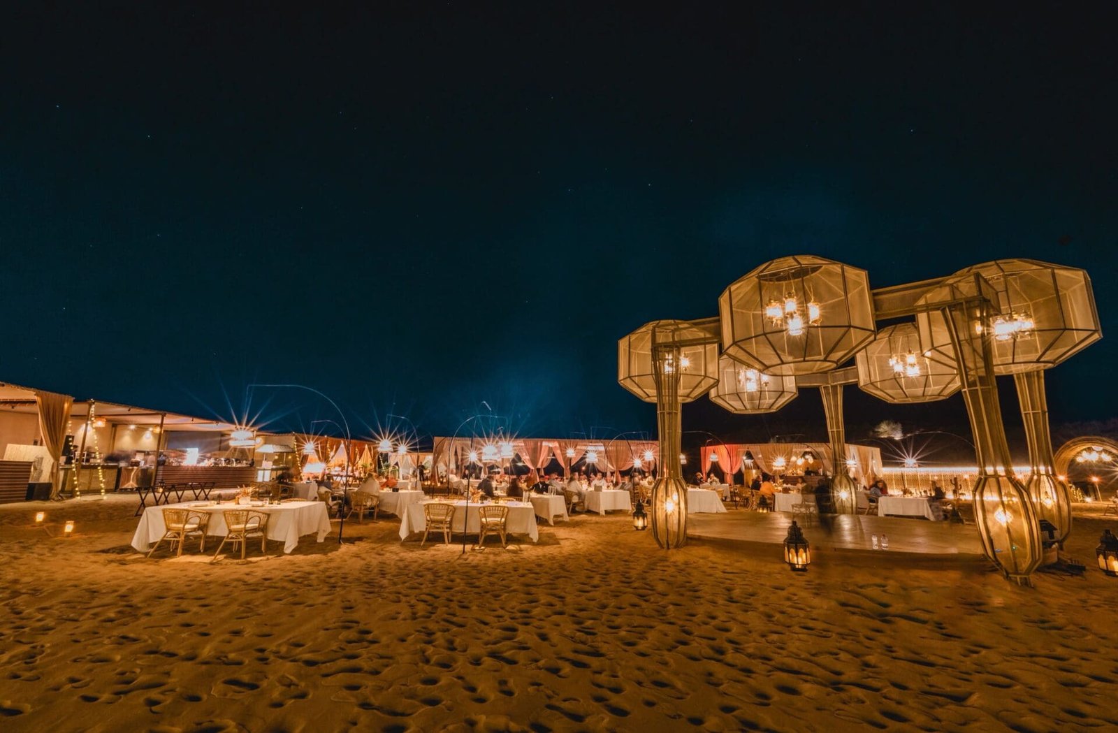 Guests arrive as the sun begins its descent, welcomed into a landscape defined by calm rhythm and tradition. Camel rides across the golden dunes, falcon displays at dusk and delicate henna artistry anchor the experience in heritage. The gentle resonance of live oud music drifts through the air as firelight flickers, creating a setting where connection feels effortless.