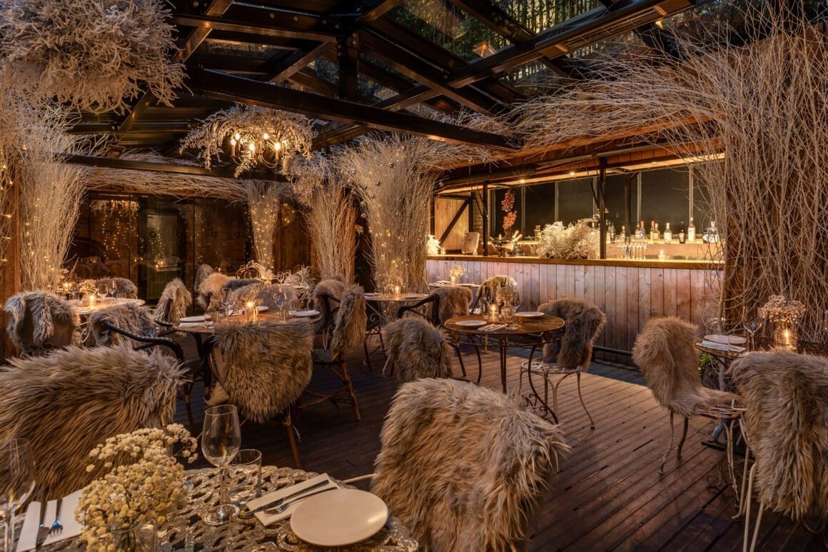 The Jurema Winter Garden, an annual highlight, invites guests into a dreamlike space adorned with frosted branches, delicate winter florals, and twinkling fairy lights. Beneath a custom glass canopy, visitors are treated to panoramic views of Jurema’s iconic hanging gardens while basking in the warmth of faux-fur blankets and candlelit tables.