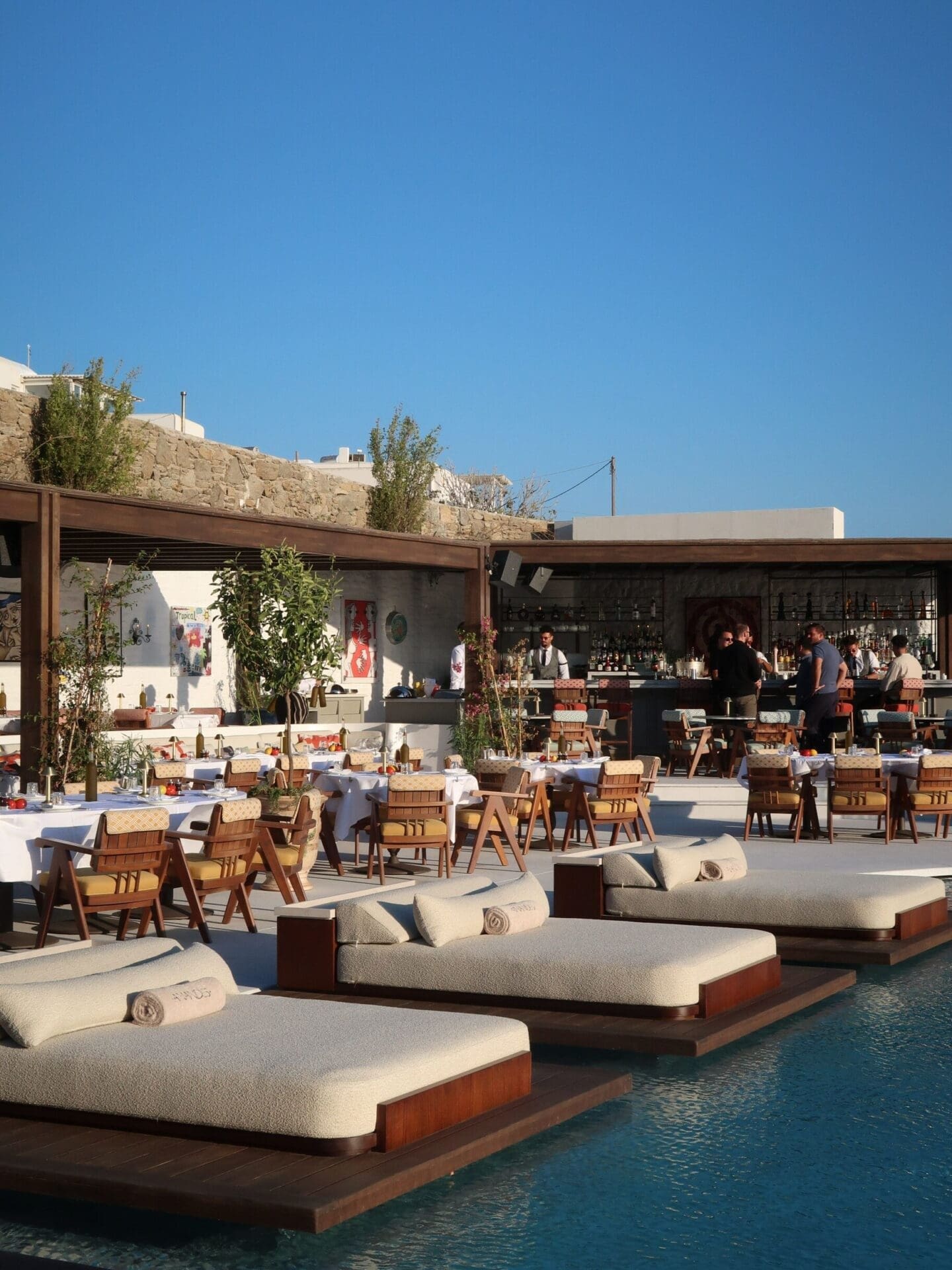 As the sun begins its golden descent, the hotel transforms into a front-row seat to one of the Aegean’s most spectacular performances: the sunset. And there’s no better place to enjoy it than poolside at La Petite Maison, the tenth global outpost of the beloved French dining institution. Here, LPM’s signature joie de vivre takes on a Mykonoian twist, offering an alfresco dining experience that is as spirited as it is sophisticated. With 125 panoramic seats, the terrace overlooks the sea, welcoming guests to share Provençal delicacies like Warm Prawns with Olive Oil and Lemon, Salt Baked Sea Bass, and Snails with Garlic Butter and Parsley. The Vanilla Crème Brûlée, of course, remains a cult favourite, while the Tomatini cocktail continues to charm with its crisp, savoury finish.