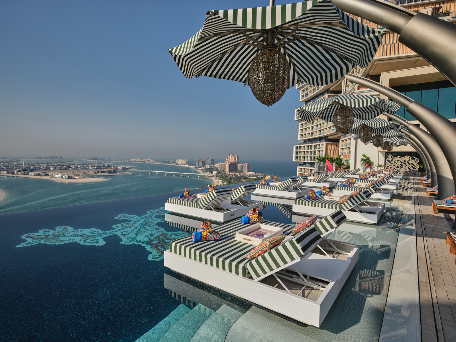 Perched 96 meters above The Palm, Cloud 22 offers panoramic views of the Arabian Sea, Palm Islands, and Dubai’s glittering skyline. Spanning 90 meters in length, this architectural marvel is a symphony of luxury — featuring a vast infinity pool, floating beds, 11 private cabanas with plunge pools, and a two-storey VVIP cabana complete with its own floating infinity pool. The Dolce&Gabbana aesthetic transforms this contemporary retreat into a cinematic summer tableau suspended between sky and sea.