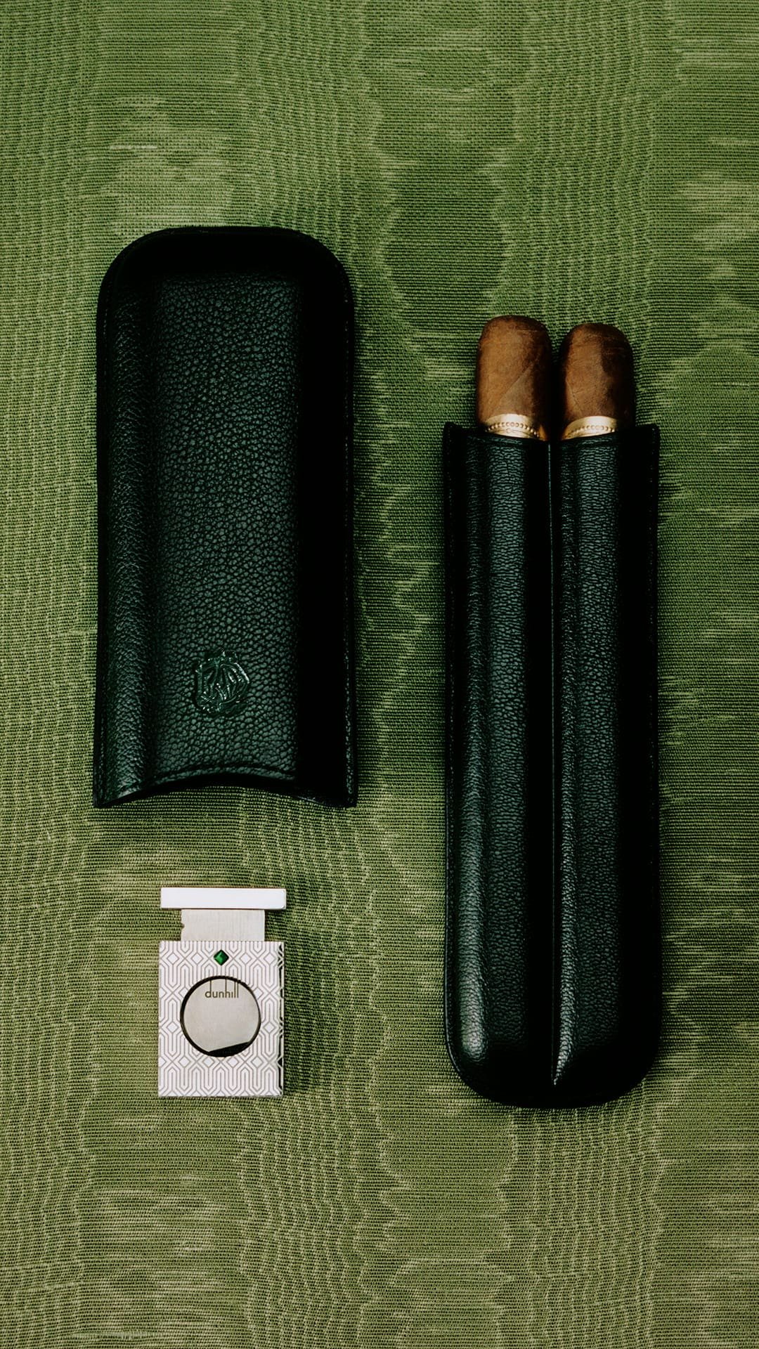 For cigar connoisseurs, the goatskin duo cigar case in racing green embodies traditional artistry. Wet-moulded by Spanish craftsmen over wooden forms, the vegetable-tanned goatskin is selected for its sculptural integrity and ability to develop a rich patina over time. Designed to hold two cigars, it remains discreet yet distinctive, finished with an embossed Cypher that signals heritage without excess.