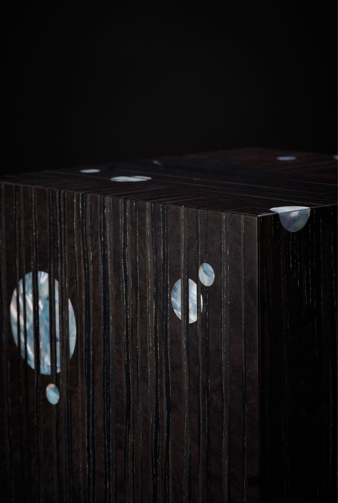 From the outside, Mystery Box: Forget Time is a mesmerizing display of black marquetry lines and mother-of-pearl inlays, crafted in collaboration with Hawthorne Fine Boxes. Artisan Emeline Dépail’s intricate woodwork evokes drifting photons, their motion frozen mid-journey. Fragmented patterns spiral from a central point, suggesting both expansion and dissolution—time simultaneously gathering and slipping away.