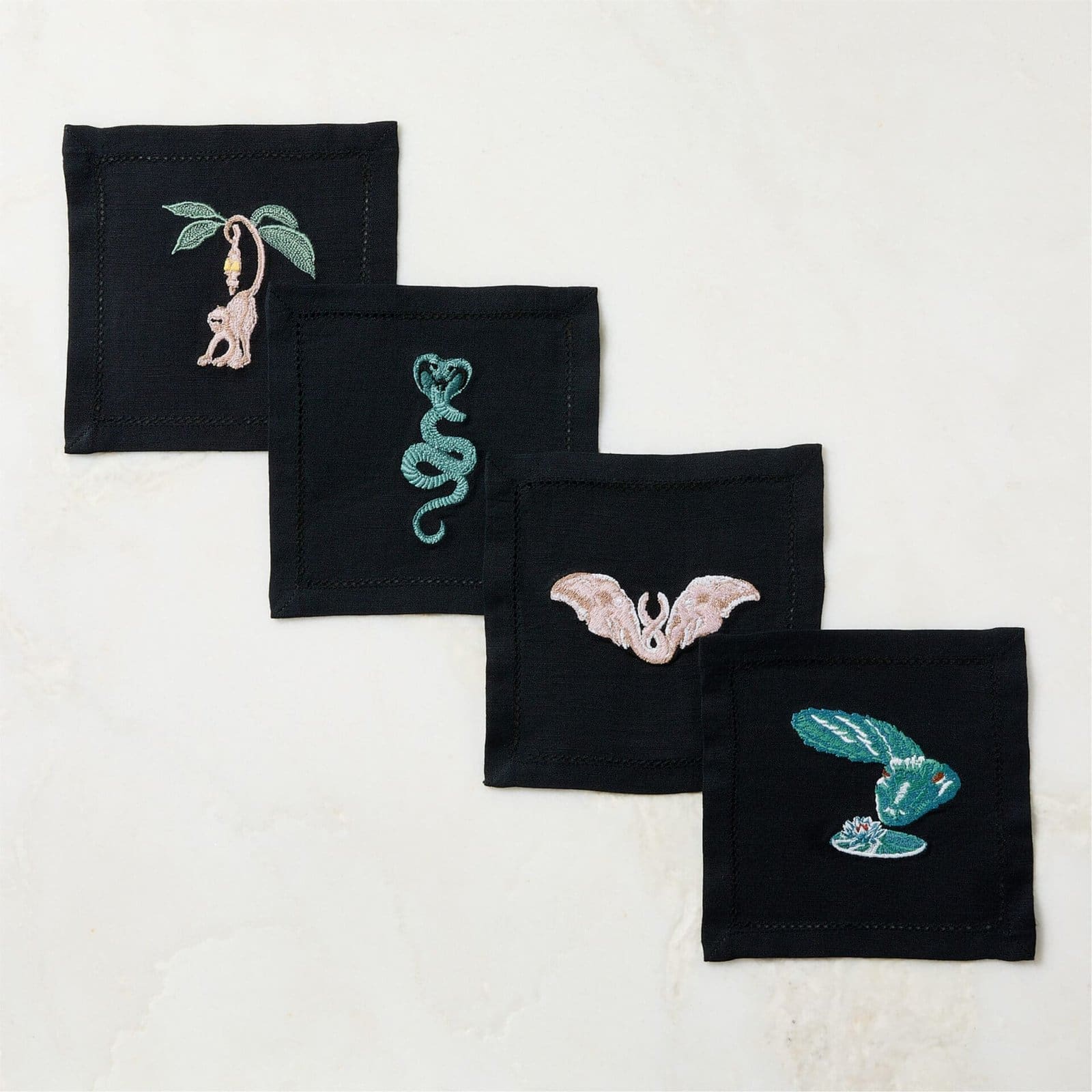 Elevated entertaining is also on the menu. The Embroidered Cocktail Napkin Set (AED 135) is an easy entrée into the world of CB2 x The White Lotus—black, linen-blend, and embroidered with the jungle’s finest creatures. Pair them with the Brass Cocktail Picks (AED 160), each tipped with symbolic motifs from the show’s third season, for drinks that carry a sense of place—and a hint of mystery.