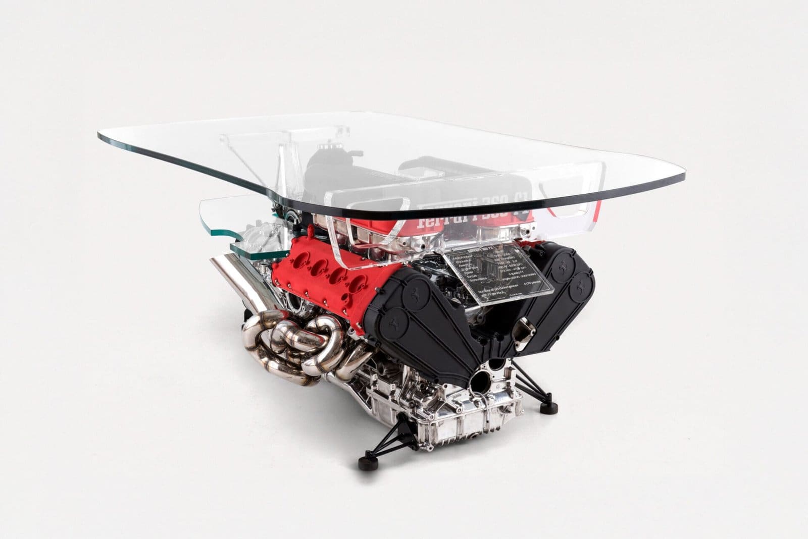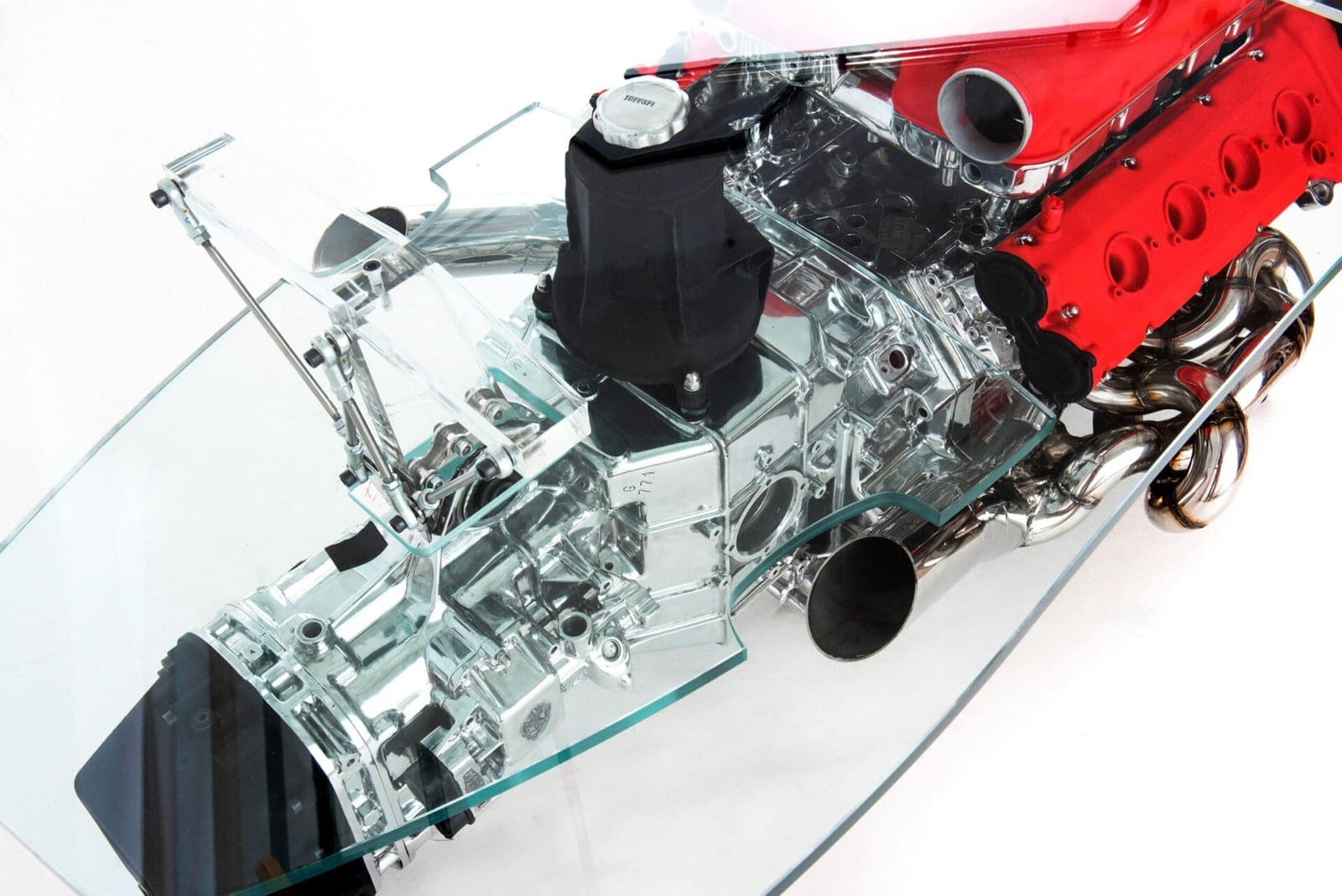 The engine at the core of this creation was acquired by the current consignor around a decade ago. Over approximately 600 painstaking hours, it was transformed into a functional artwork. Internal mechanical components were removed to reduce weight without compromising its visual power, and the remaining parts were meticulously polished and lacquered for lasting protection. The intake manifolds were custom-built from stainless steel, paying tribute to early 2000s Ferrari Formula 1 design. Meanwhile, the glass top was shaped to evoke the silhouette of a high-performance vehicle.