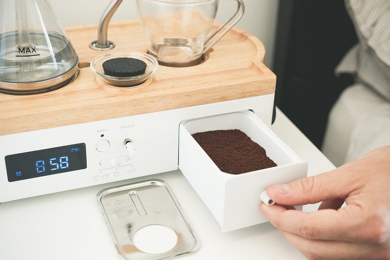 The Barisieur’s simple base houses the underlying technology. An induction coil is used to boil the water efficiently and safely in the vessel above. It has a milk vessel centralised in the base that’s cooled at 3 °C thanks to an integrated peltier cooler, which detects if milk is present with the help of an infrared sensor. A retro digital display tells the time and is also used to set the alarm. The brightness of the display, managed by an integrated diode, dims in low lit environments. There is a sealed drawer to store coffee or tea powder, and whose stainless-steel lid also holds a stainless-steel spoon.