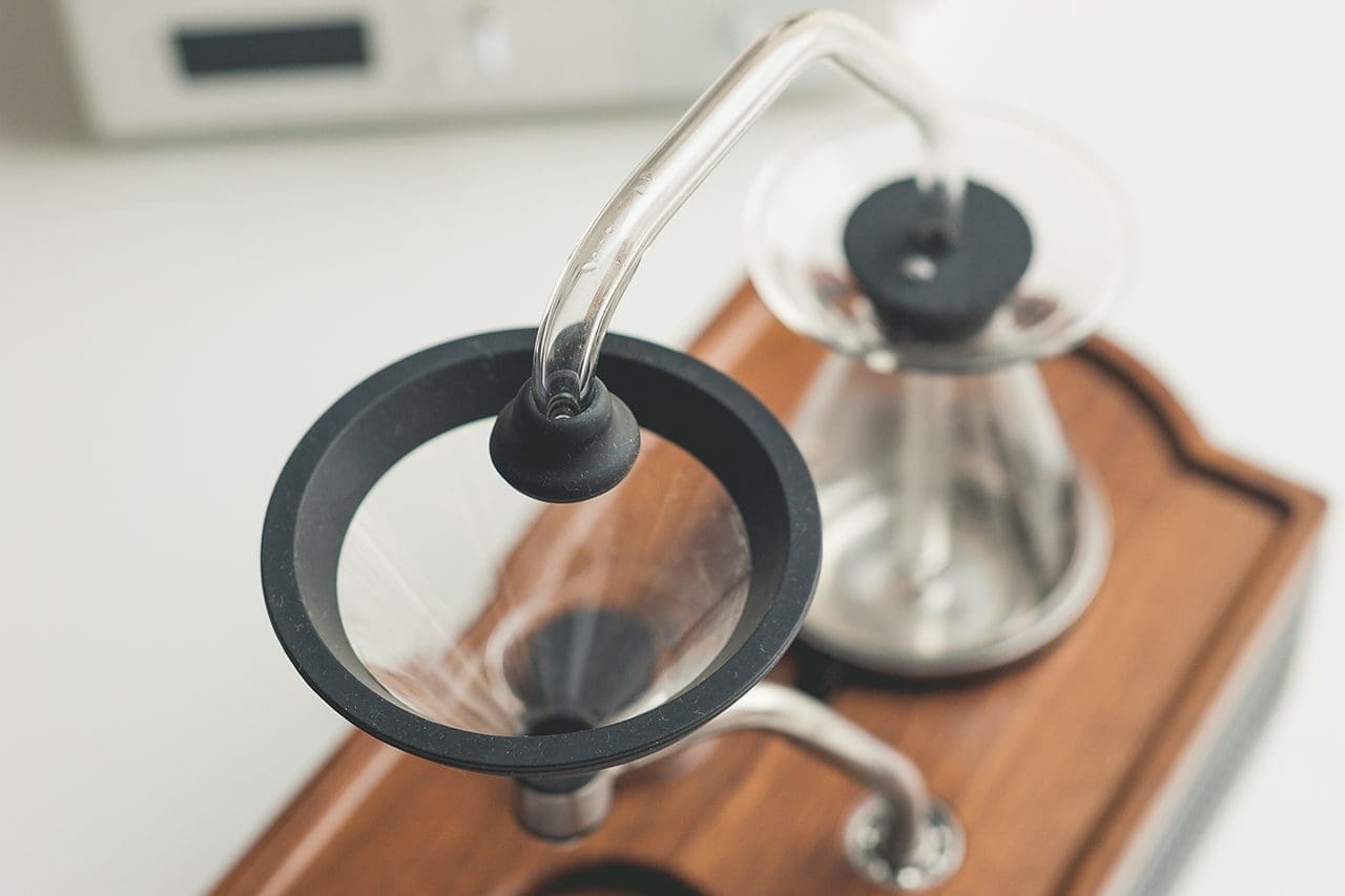 At the set time, the water in the beaker begins to boil, lifts through the tube and drops into the funnel positioned above the cup. What comes out at the bottom of the funnel is a hot, aromatic, freshly brewed coffee.