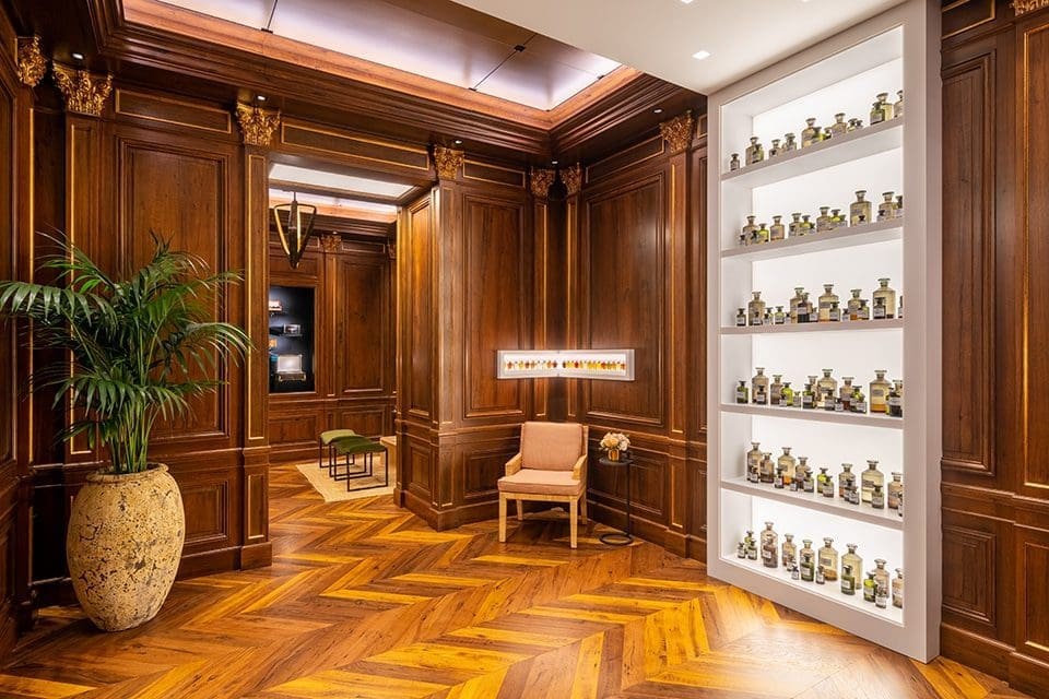 The boutique fronts the pedestrian-only cobblestone courtyard of Two Rodeo, on Rodeo Drive. It is fronted by large windows, offering visitors a generous glimpse of the tranquil atmosphere inside. Upon entering the boutique’s reception room, one is greeted by solid old oak wood walls and cabinets. The flooring, in a chevron pattern, provides the first sense of being transported to a refined residence. The embellished matte gold ceiling features a Corian “catwalk” that draws all eyes to the beating heart of the boutique: the illuminated Corian perfume organ. Flanking this wall of flasks, beakers and containers are symmetrical Corian niches that house hand-blown crystal flacons filled with Henry Jacques’ “Les Classiques” fragrances.
