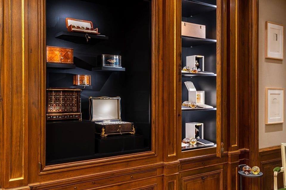 A VIP room features more of the soft comforts of a luxurious residence. This intimate and relaxed setting is elegant, comfortable and discrete, allowing clients to discover the perfumes at their own pace. The space, in general, is designed to reveal more over time; hidden cabinets or secret drawers. A prominent double-sided leather display chest protects the precious Masterpiece perfumes, historic flacons and collectors’ accessories.
