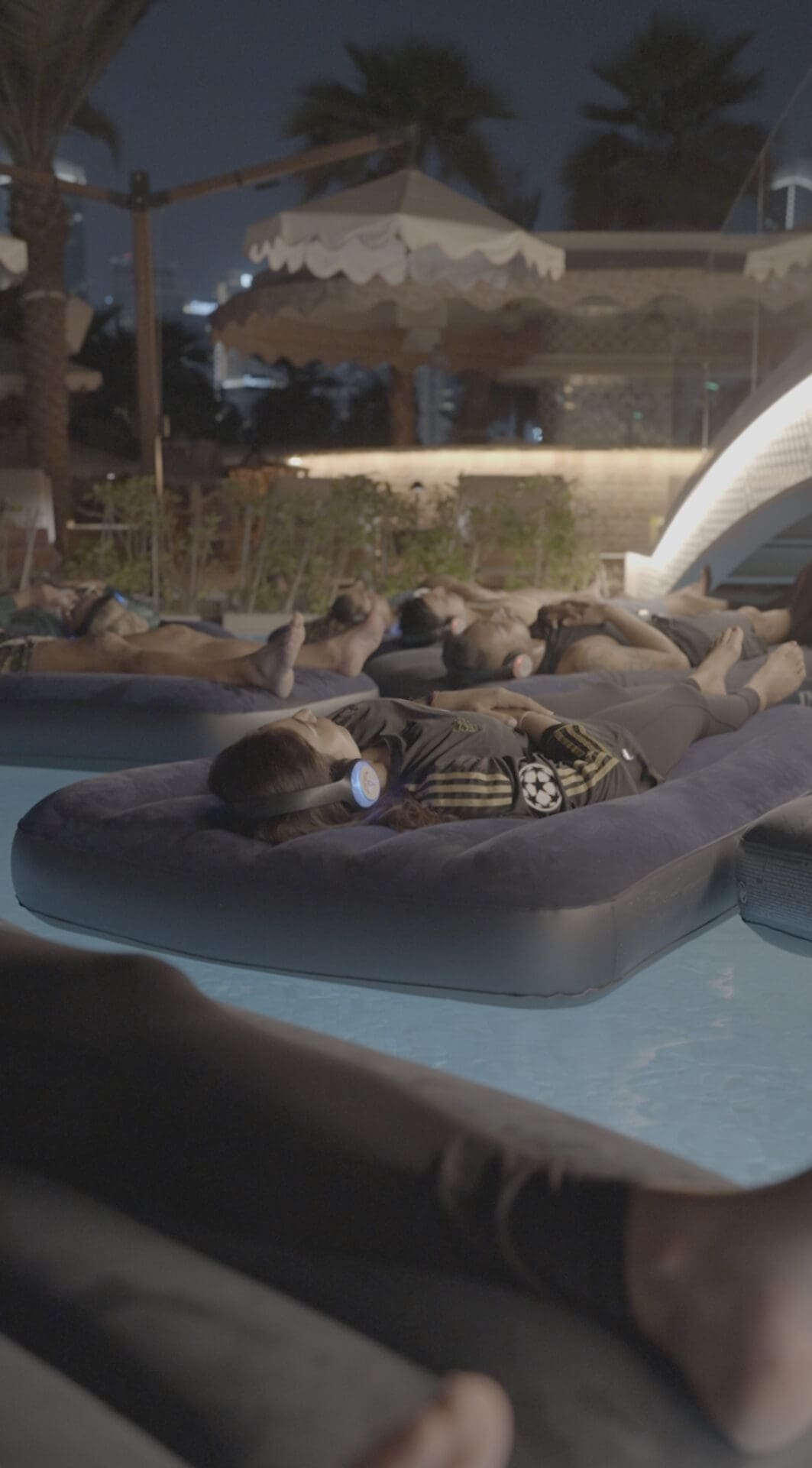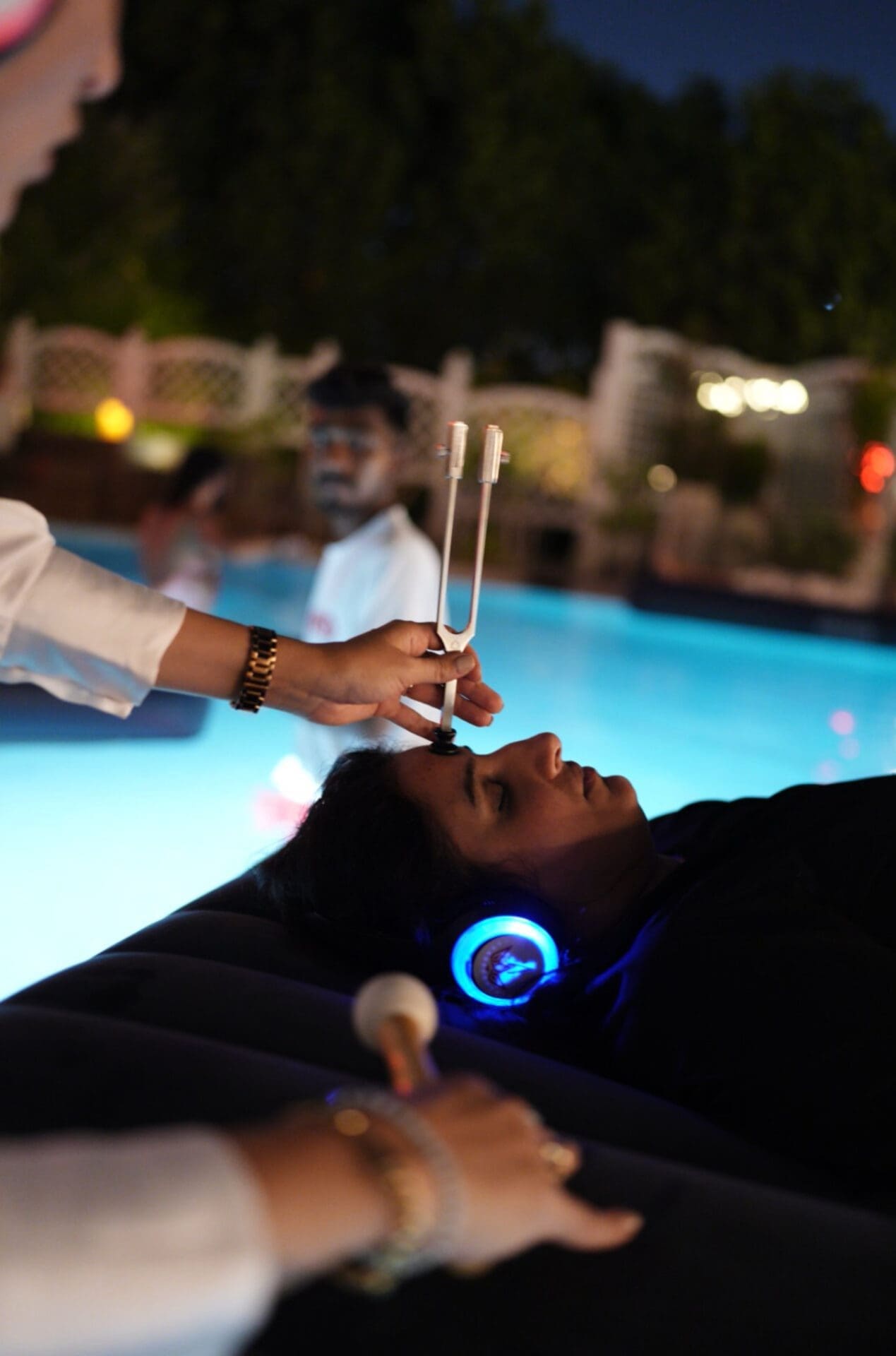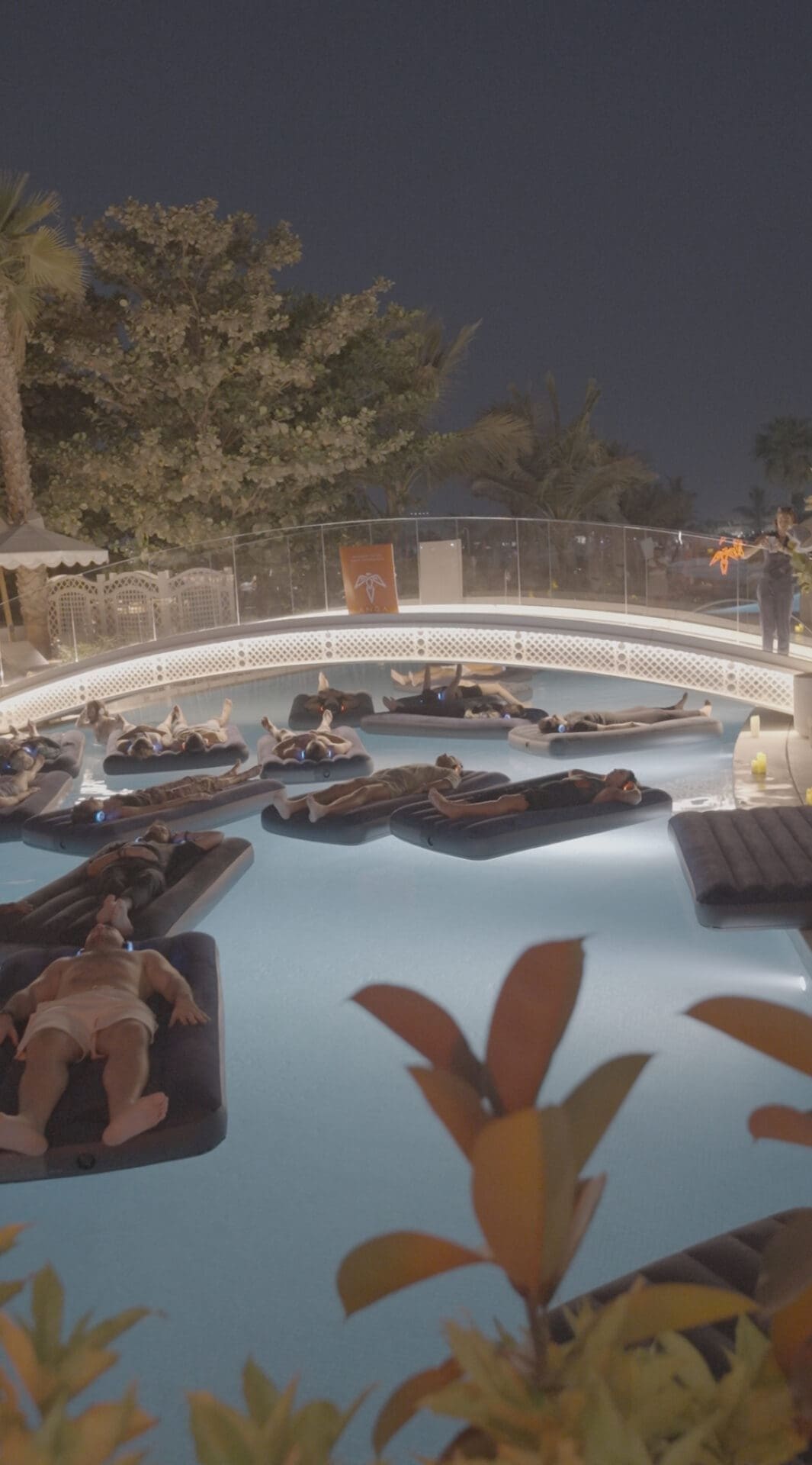 As the sun dips below the horizon, participants gather in the softly illuminated pool, where floating mats provide both comfort and a gentle connection to the surrounding elements. The session begins with guided breathwork, encouraging deeper awareness and presence, before seamlessly transitioning into a sound healing experience. The resonant tones of crystal bowls, chimes, and harmonic instruments wash over the water, easing tension and promoting a state of calm under the night sky.