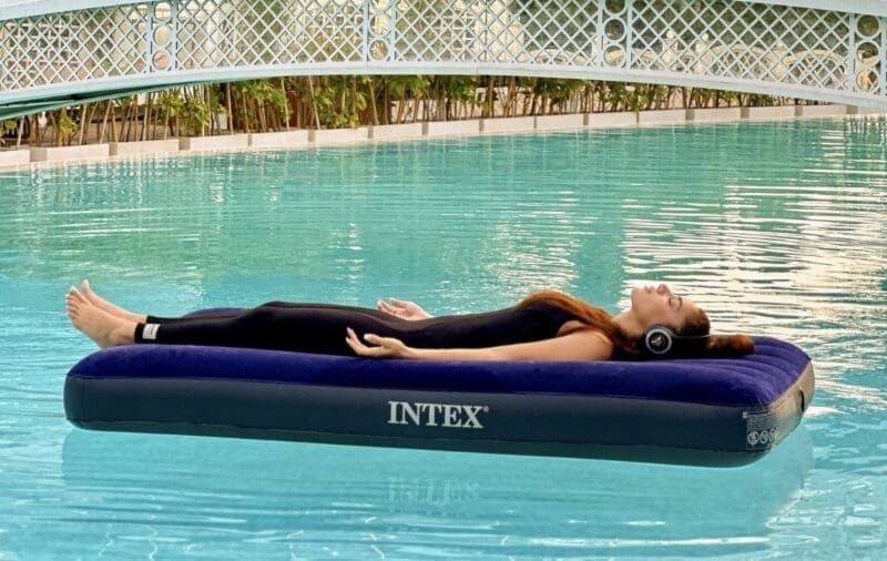 As the sun dips below the horizon, participants gather in the softly illuminated pool, where floating mats provide both comfort and a gentle connection to the surrounding elements. The session begins with guided breathwork, encouraging deeper awareness and presence, before seamlessly transitioning into a sound healing experience. The resonant tones of crystal bowls, chimes, and harmonic instruments wash over the water, easing tension and promoting a state of calm under the night sky.