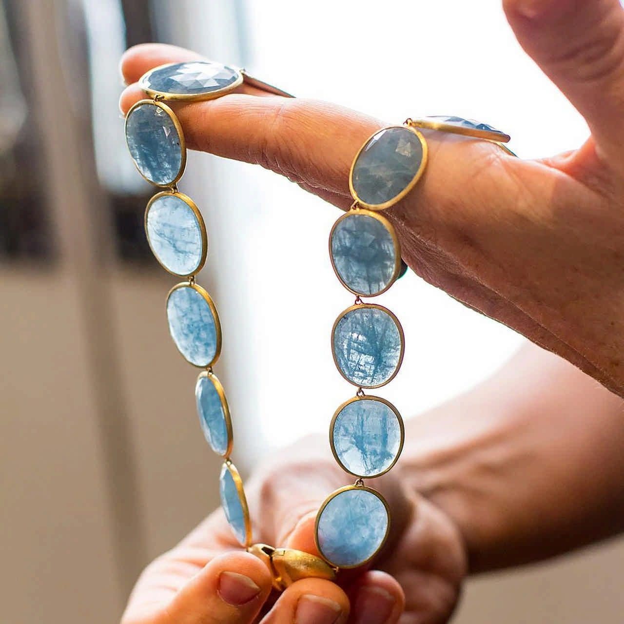 In addition to the yellow gold, we also have some white gold because some women prefer that. It’s not just plain gold; I love combining gold with precious stones, particularly multicolour gemstones, and in a unique way which renders each creation truly one-of-a-kind. I also like incorporating our signature hand-engraved pieces made with the traditional “Bulino”, which is an ancient tool for hand-carving gold. It gives the gold a fine, brushed texture. I did not invent this technique, but I brought it back into use. We also use gold spheres in our jewellery that are unique. I use a signature technique taught to me by my father whereby the spheres are not cast solid but are hollow. This technique allows us to incorporate large spheres into our designs while keeping them light and comfortable for the wearer.