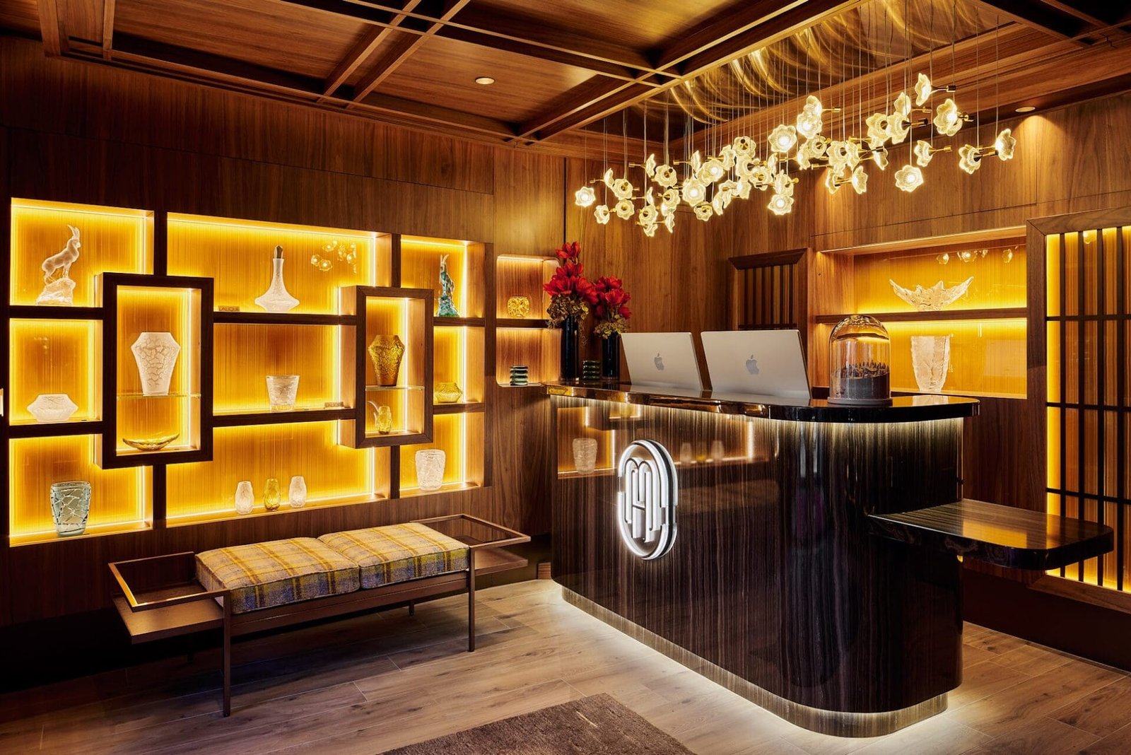 The hotel’s interiors are defined by restraint and harmony. Natural wood, stone, bronze, and metal are layered with meticulous intention, creating a cocoon-like atmosphere that feels both contemporary and timeless. This dialogue between European savoir-faire and Japanese minimalism extends throughout the bespoke rooms and suites, culminating in the Lalique Suite and Lalique Apartment. Each features private treatment rooms and exclusive crystal creations by Maison Lalique, including a striking lobby chandelier composed of 60 floating crystal anemones—an ethereal tribute to falling alpine snow.