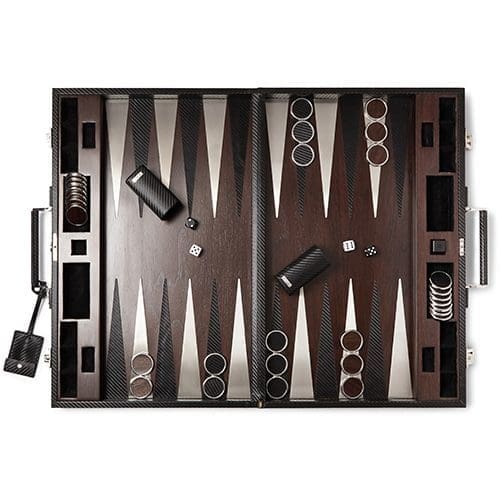 The backgammon set, made from rich walnut, comes with dice, doubling cube, counters and cups. It has a lock and comes with an elegant full-grain leather box cover.
