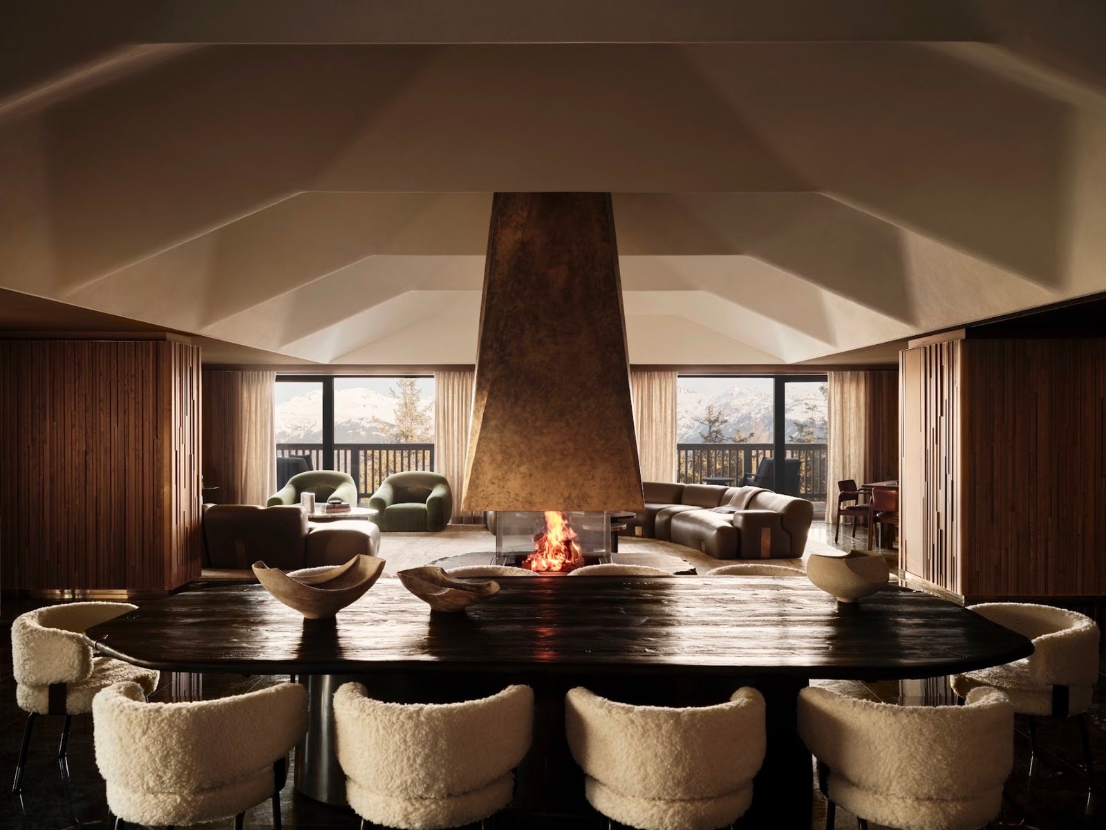 Inside, each room and suite is designed as a refined alpine residence offering a continuous dialogue with the surrounding peaks. Private terraces allow guests to take in sweeping mountain views, while bespoke details such as illuminated Himalayan salt installations create soft ambient lighting. The interiors combine sculptural design with organic textures, delivering a sense of warmth and tranquillity after a day on the slopes.