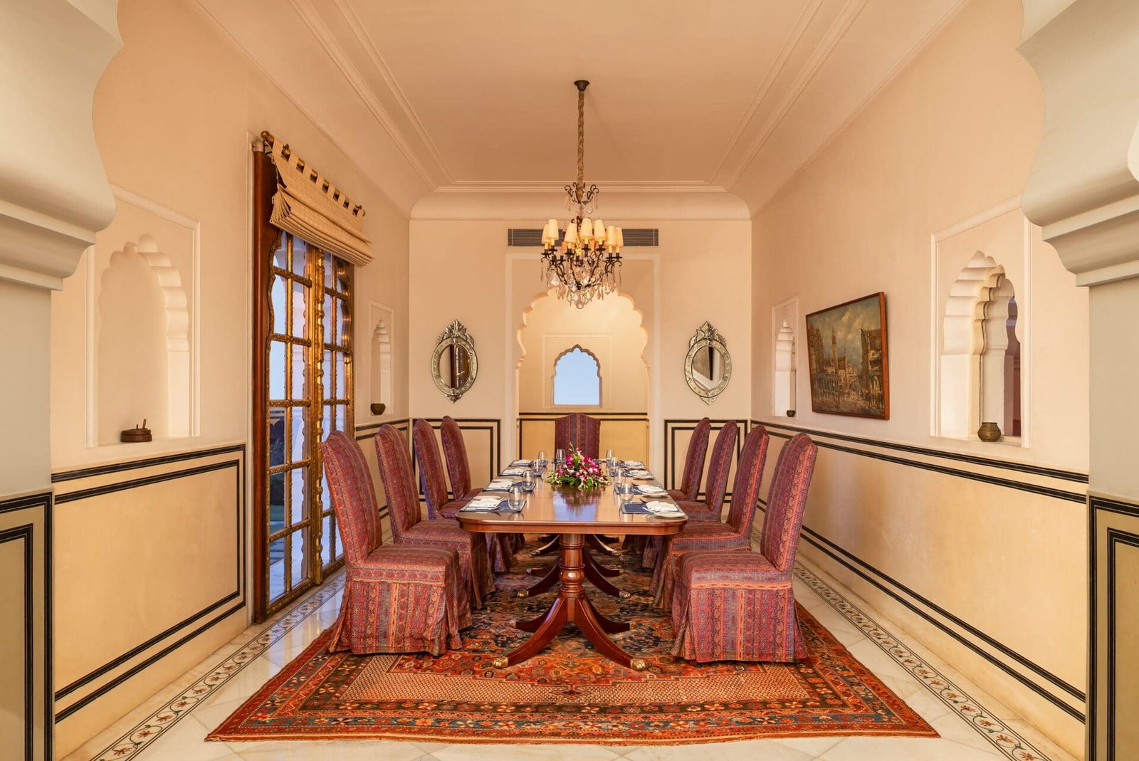 Dining is woven into the experience as a personal ritual. Oberoi chefs design menus daily in consultation with guests, drawing inspiration from royal Rajasthani and Mughal traditions alongside refined international cuisine. Meals may be enjoyed in the mirror-adorned dining hall, beneath open skies in the gardens, beside the pool, or on terraces overlooking the landscape.