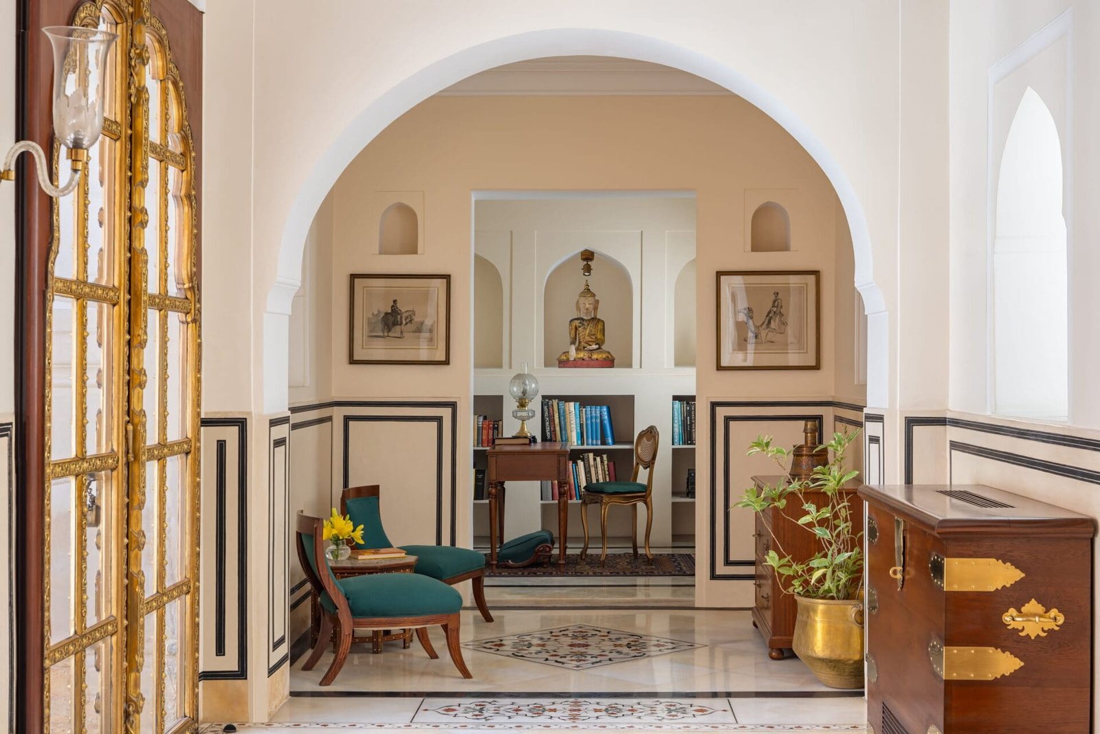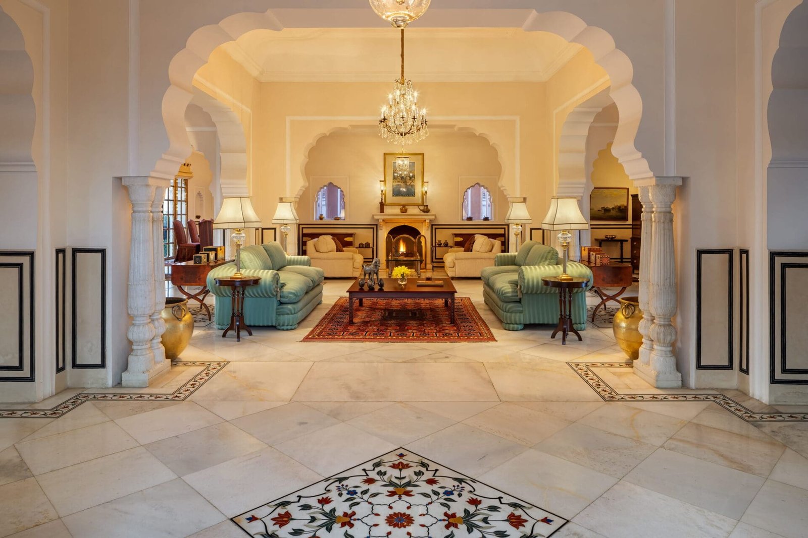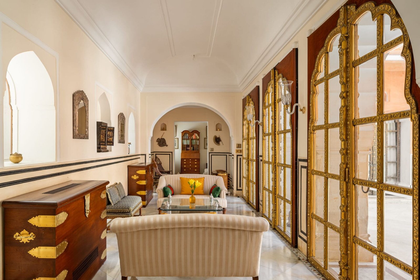 Sunlit courtyards, carved archways, elegant salons, and expansive terraces define the fort’s character. Antique furnishings, curated artworks, and original architectural details evoke its noble lineage. These elements are complemented by contemporary comforts and attentive, unobtrusive service that allows the space to feel like a private home rather than a hotel.