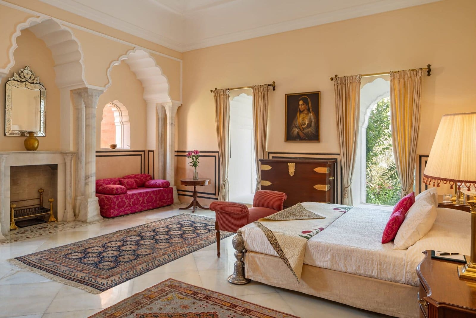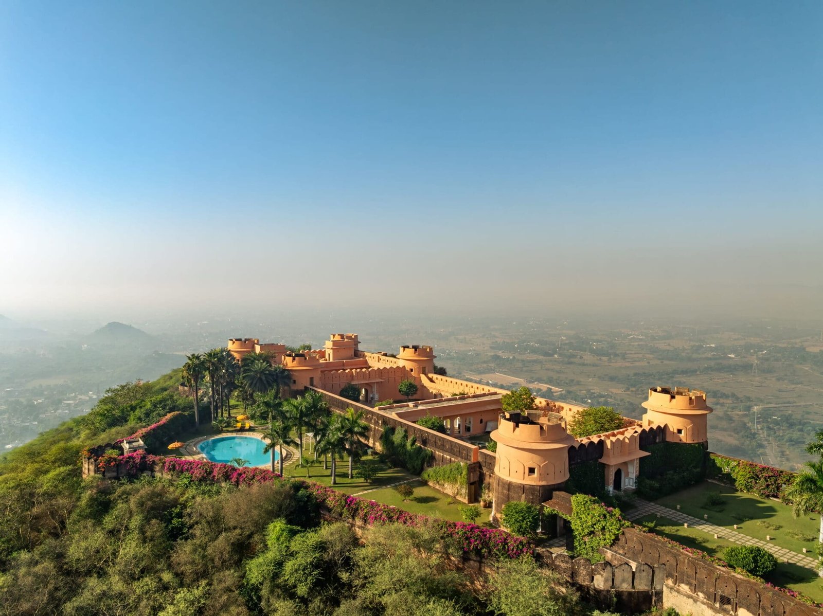 Set on a gentle hilltop, the residence offers sweeping views across the countryside and toward the Aravalli hills. The sense of seclusion is immediate, heightened by the fort’s positioning and natural surroundings. Yet Jaipur’s cultural heart remains close, allowing guests to move effortlessly between tranquil retreat and vibrant heritage.