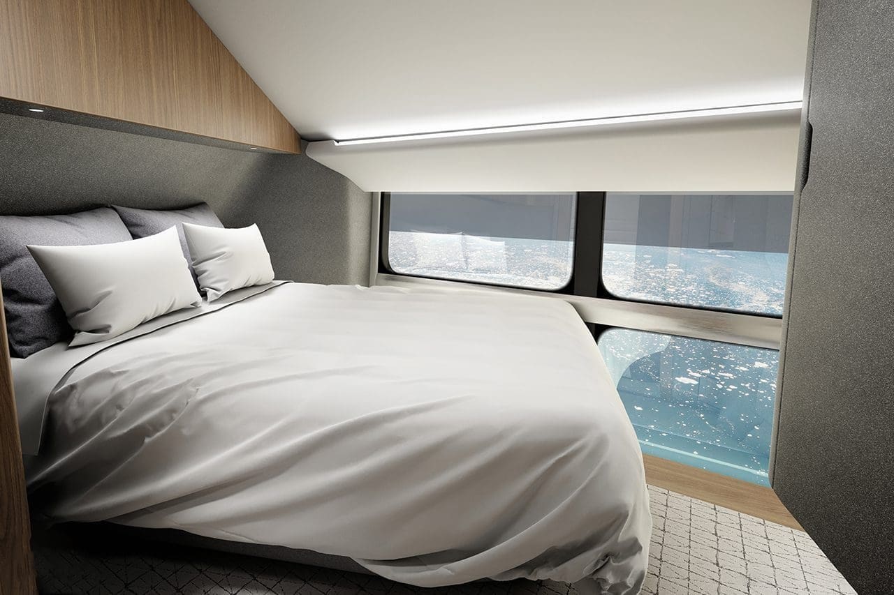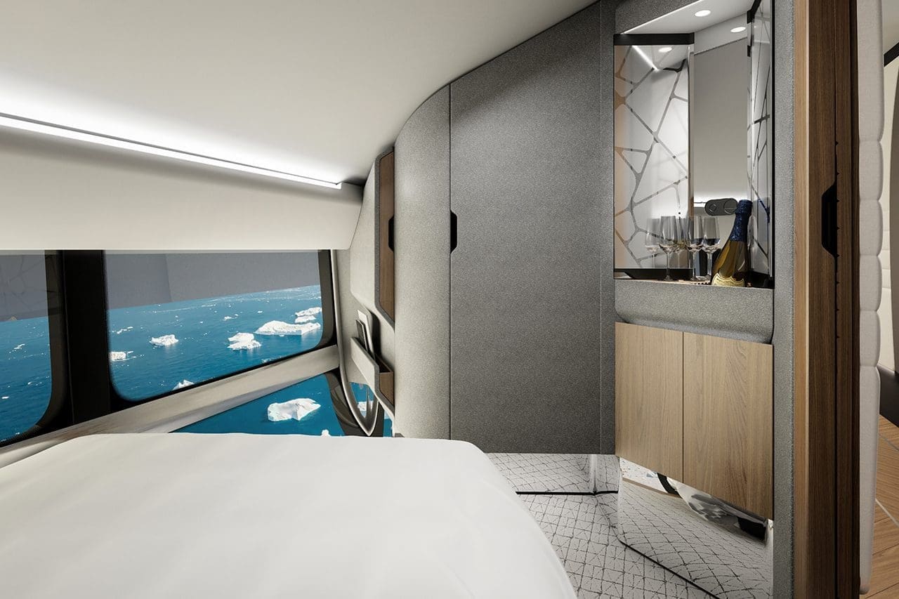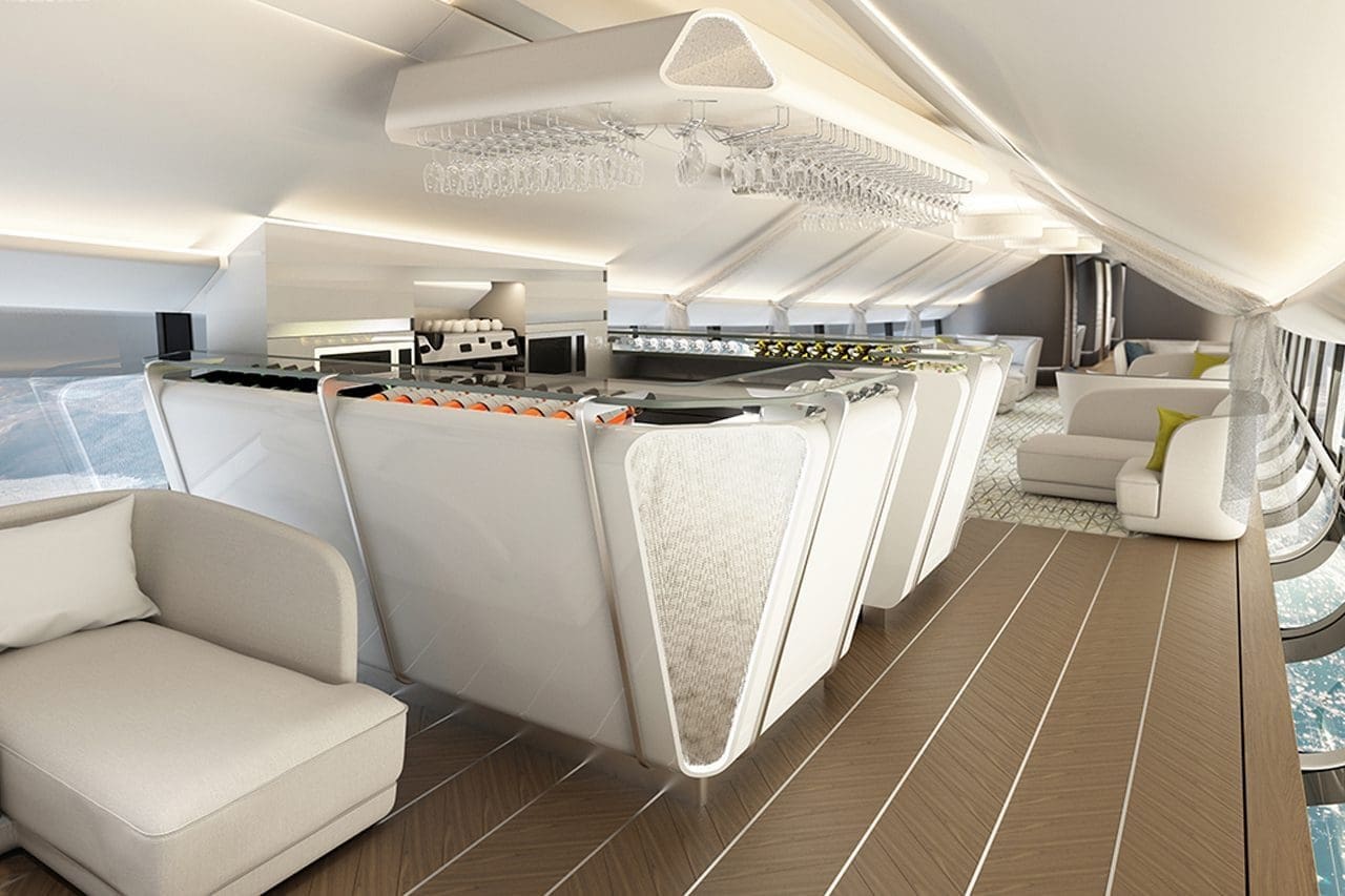 The luxury of space combined with the modular design approach allows for several types of luxuriously appointed suites to be incorporated into the design. Passengers will be able to enjoy horizon-to-horizon views throughout the aircraft, including the extensive ‘Infinity Lounge’ where “the sofas, generous in proportion for total relaxation and with the unique ability to rotate, allow perfect outward vision through the massive panoramic windows, or they can turn to face inwards for evening social events,” says Howard.