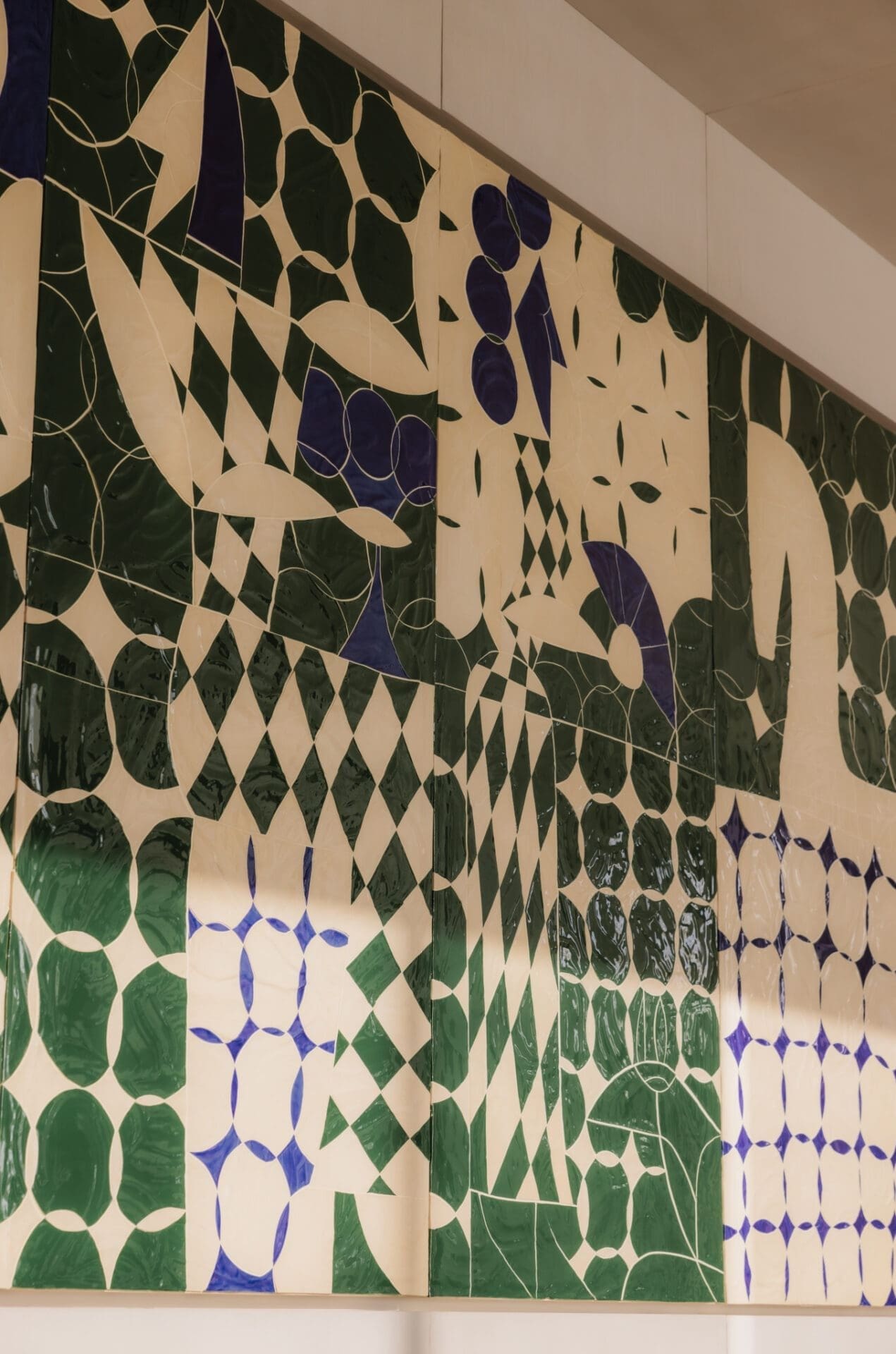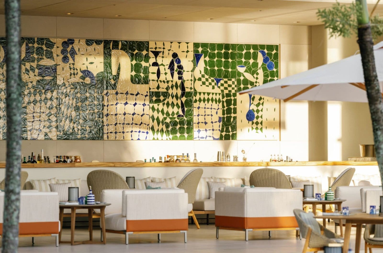 The journey continues at Vivamento, where Parisian artist Maximilien Pellet brings a sense of theatrical joy. His fresco, inspired by the conviviality of Etruscan banquets, ripples across the bar’s surface in minimalist graphic elegance. The dance of light on the glossy plaster evokes both nostalgia and celebration, casting a contemporary lens on classical motifs and echoing the Maison’s passion for timeless storytelling.