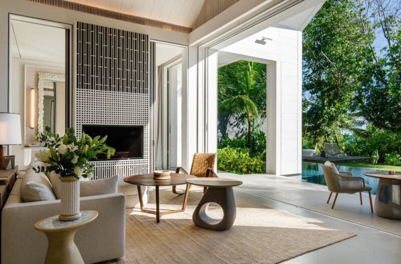 From the moment guests arrive, they are welcomed by the Maison’s signature Wild Green, a hue that mirrors the lush biodiversity of Seychelles. This vibrant tone breathes life into the interiors, softly blending with the island’s earthy tones of taupe and beige, creating a seamless transition between the indoors and the surrounding nature. This connection is more than visual — it is emotional, grounding visitors in the island’s pulse.
