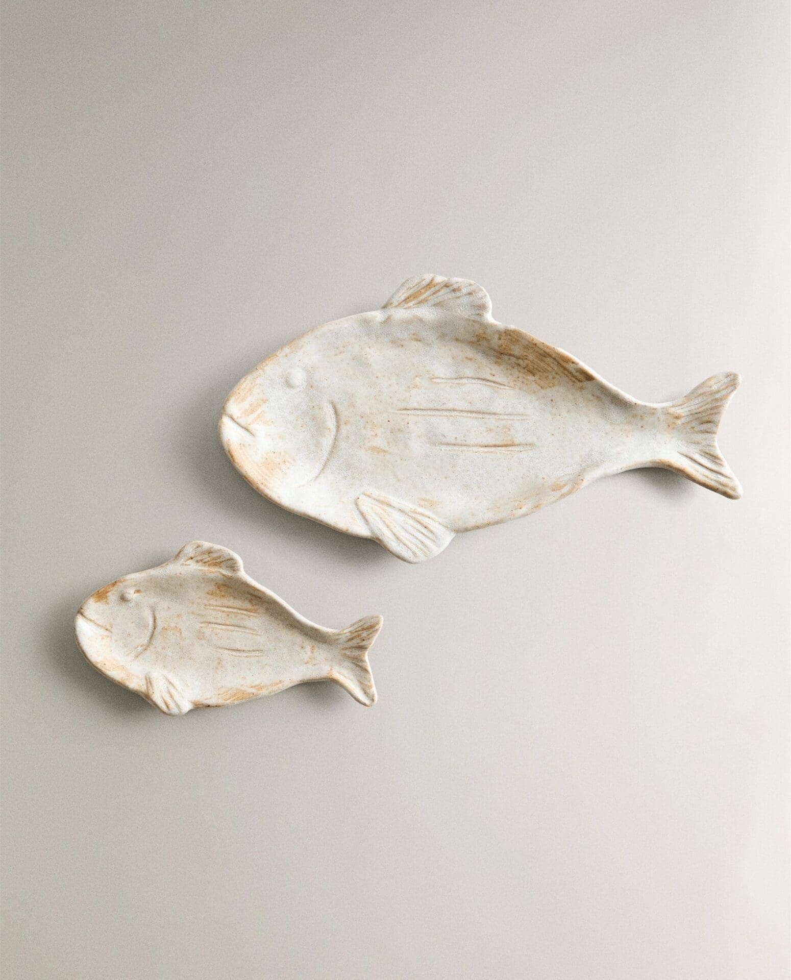 A standout of the collection is a decorative stoneware tray shaped like a fish, blending practical function with playful form. This piece embodies the spirit of the collection – organic, textural, and evocative of ocean life. It pairs beautifully with other ocean-inspired accents in the range, creating a cohesive coastal look.